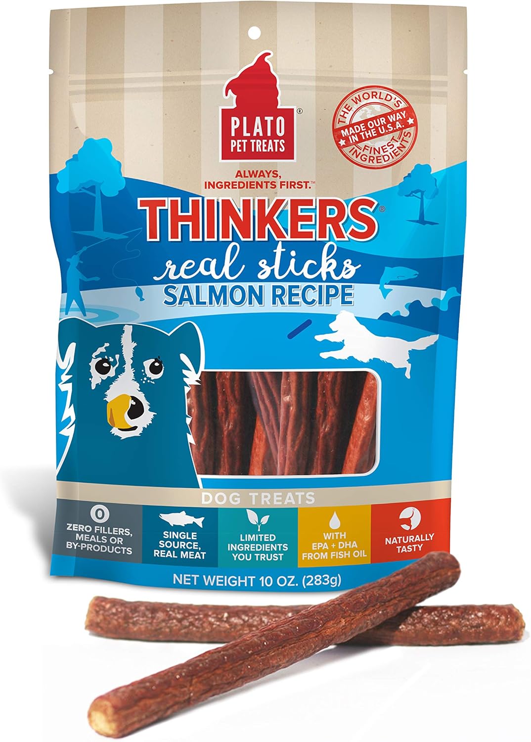 Thinkers Salmon Are Hearty, Meat-Packed Sticks With Added Epa And Dha To Support Healthy Brain Function, Are A Natural Source Of Omega 3 & 6 Fatty Acids, And Support Skin And Coat Health. Made With Real Salmon As The 1St Ingredient, These Treats Are Made With Limited Ingredients, Are Naturally Preserved, And Contain No Artificial Flavors, Corn, Wheat, Or Soy. Because Of Their Large Size, Thinkers Offer Substantial Chewing Satisfaction Or Can Be Broken Into Smaller Pieces To Create Multiple Treats. And We Take The Extra Time To Air-Dry Them In Batches In Our Usa Facility Instead Of Baking Them In Order To Retain More Of The Ingredients' Inherent Nutrients (But Your Dog Will Just Think That They Smell And Taste Amazing). It Takes Longer, But We Think Its Worth It. Thinkers Also Come In Chicken, Duck And Lamb