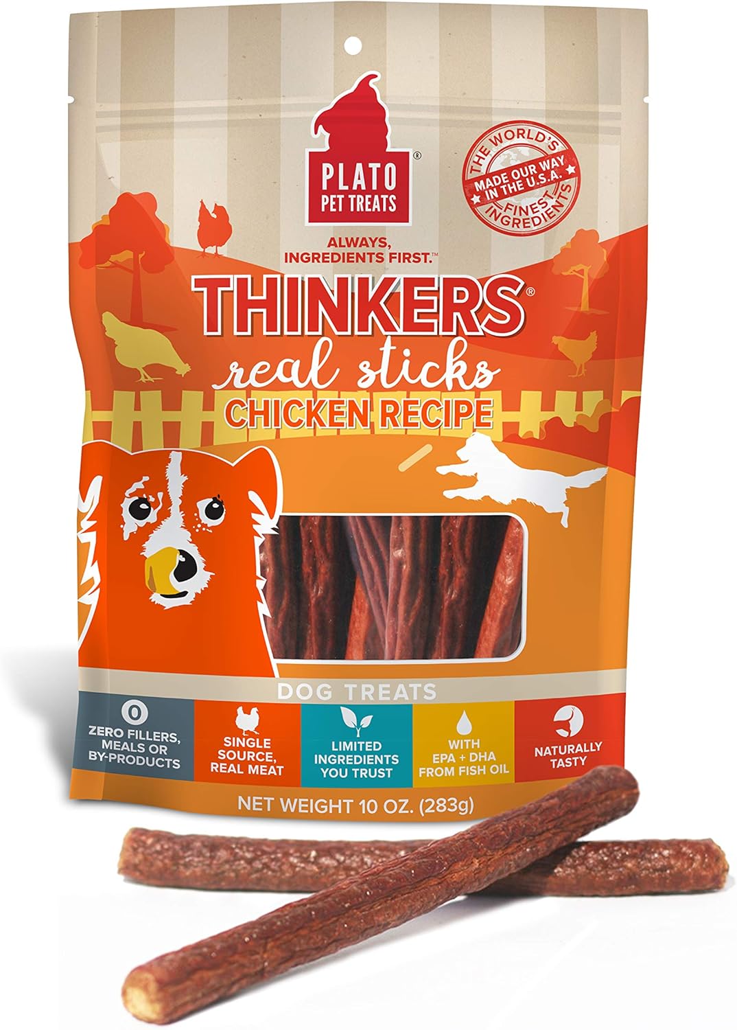Thinkers Chicken Are Hearty, Meat-Packed Sticks With Added Epa And Dha To Support Healthy Brain Function. Made With Real Chicken As The 1St Ingredient, These Treats Are Made With Limited Ingredients, Are Naturally Preserved, And Contain No Artificial Flavors, Corn, Wheat, Or Soy. Because Of Their Large Size, Thinkers Offer Substantial Chewing Satisfaction Or Can Be Broken Into Smaller Pieces To Create Multiple Treats. And We Take The Extra Time To Air-Dry Them In Batches In Our Usa Facility Instead Of Baking Them In Order To Retain More Of The Ingredients' Inherent Nutrients (But Your Dog Will Just Think That They Smell And Taste Amazing). It Takes Longer, But We Think Its Worth It. Thinkers Also Come In Salmon, Duck And Lamb