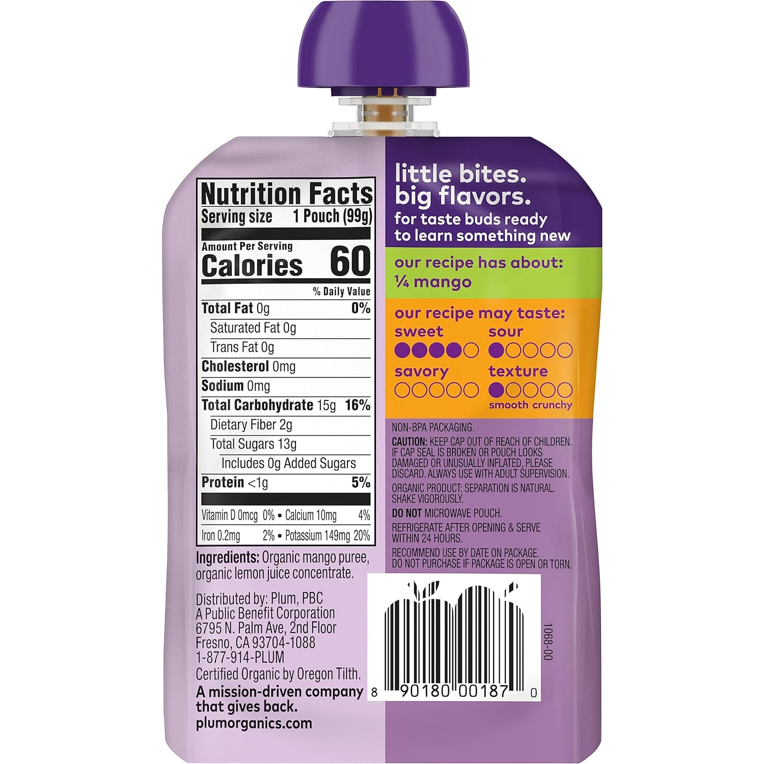 Plum Organics just mangos baby food is the perfect solution for nourishing your growing baby with the flavors they love and the nutrients they need. Our baby food is made with no salt or sugar added and is Non-GMO project verified. Additionally, our product is USDA organic certified and kosher. Included is one 3.5 ounce container of Plum Organics just mangos baby foodORGANIC BABY FOOD PUREE WITH MANGO: Certified Organic & Non-GMO Project Verified, with 2 grams of fiber from mangoFRUITS FOR STAGE 1 FEEDING: Perfect for 4+ months, our organic baby foods are unsweetened & unsalted, and Kosher ParveRESEALABLE POUCHES ARE EASY TO USE: Non-BPA pouches serve as much yummy, nutritious food as baby needs at home or on-the-goWE'RE A B CORP: At Plum Organics, we're committed to our customers and our planet, and are focused on sustainable product design and safe ingredient sourcing
