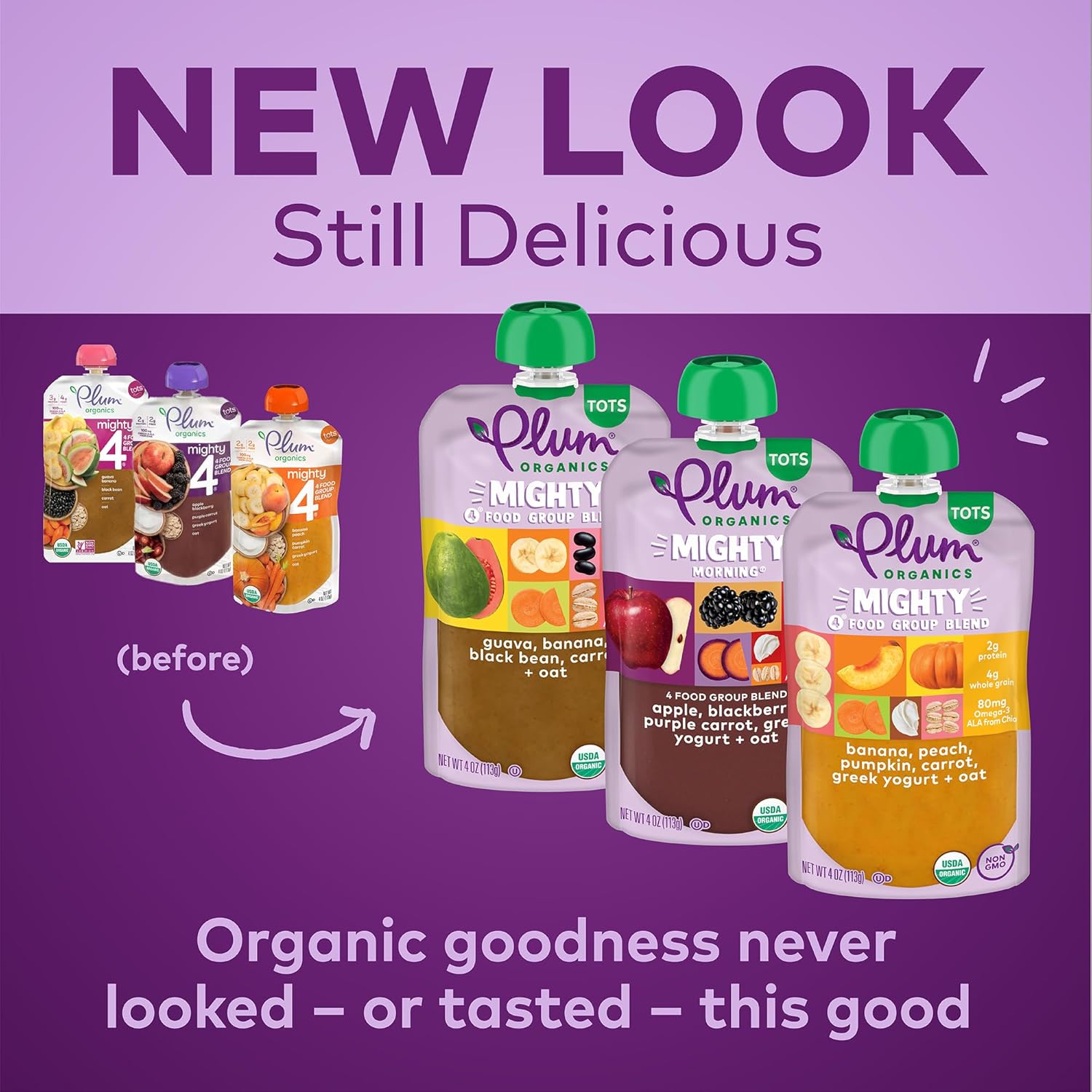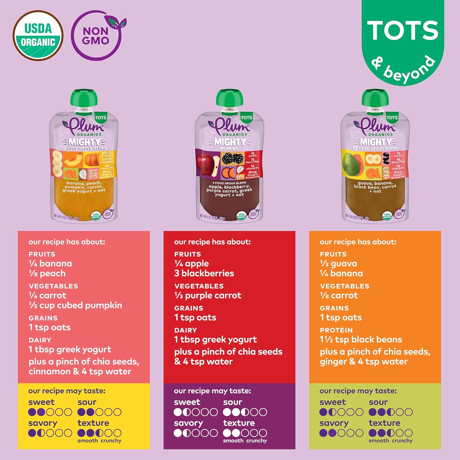 Mighty Blends For A Mighty Toddler. Plum Organics Mighty 4 And Mighty Morning Blends Are Filled With Essential Nutrients From 4 Food Group Favorites - Organic Fruits, Veggies, Dairy, And Grains - For The Perfect Snack To Fuel Your Active Toddler. Our Banana, Peach, Pumpkin, Carrot, Greek Yogurt, And Oat Blend, Apple, Blackberry, Purple Carrot, Greek Yogurt, And Oat Blend, And Guava, Banana, Black Bean, Carrot, And Oat Blend Are Each Made With Only Non-Gmo, Organic Ingredients For An Organic Toddler Food That Your Toddler Will Love. Our Plum Organics Pouches Are Naturally Preserved, Unsalted, Unsweetened, And Kosher Dairy. And Since Our Baby Food Pouches Are Convenient, Portable, And Resealable, You Can Customize Portion Sizes, Whether You'Re At Home Or You Need A Simple Snack On The Go