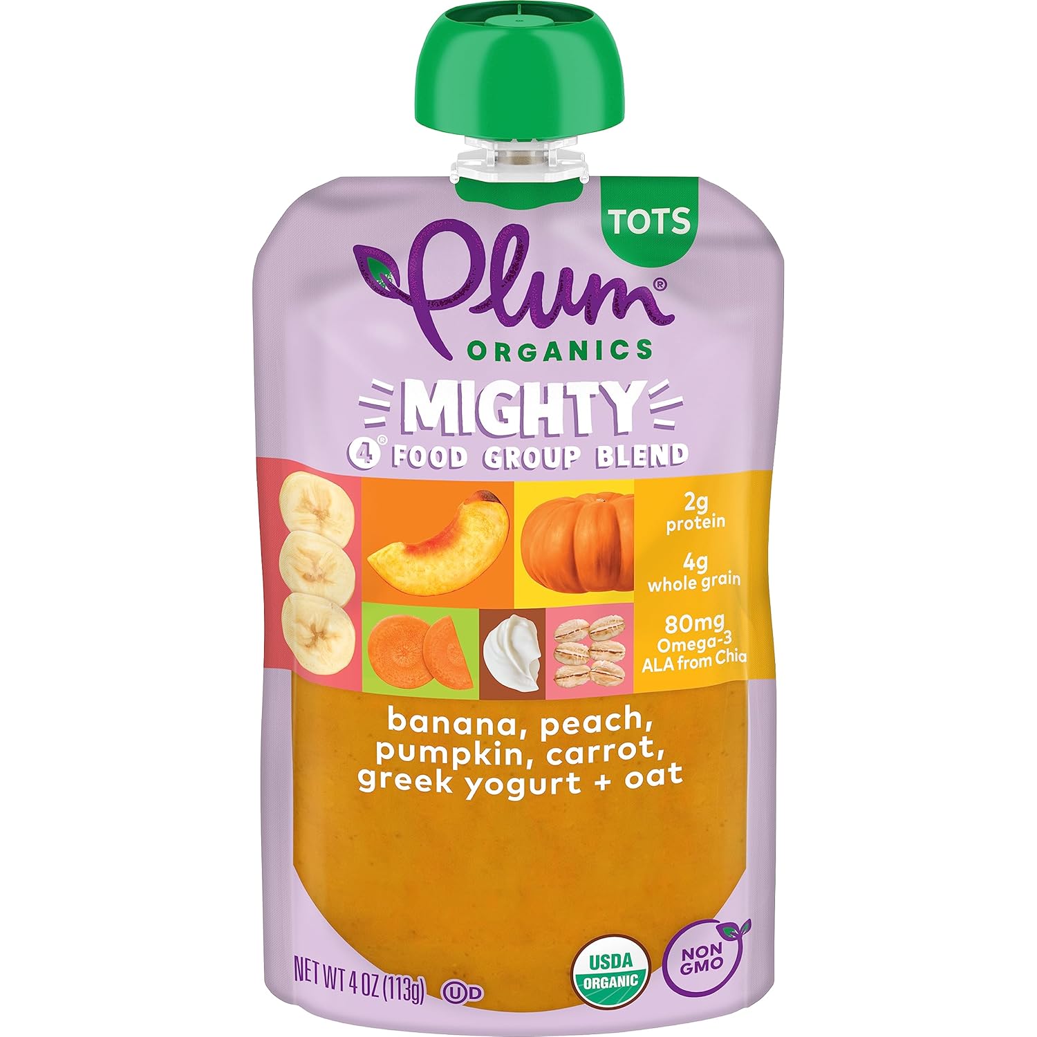 Mighty Blends For A Mighty Toddler. Plum Organics Mighty 4 Blends Are Filled With Essential Nutrients From 4 Food Group Favorites - Organic Fruits, Veggies, Dairy, And Grains - For The Perfect Snack To Fuel Your Active Toddler. Our Banana, Peach, Pumpkin, Carrot, Greek Yogurt, And Oat Blend Is Made With Non-Gmo, Organic Ingredients For An Organic Toddler Food That Your Toddler Will Love. Our Plum Organics Pouches Are Naturally Preserved, Unsalted, Unsweetened, And Kosher Dairy. And Since Our Baby Food Pouches Are Convenient, Portable, And Resealable, You Can Customize Portion Sizes, Whether You'Re At Home Or You Need A Simple Snack On The Go