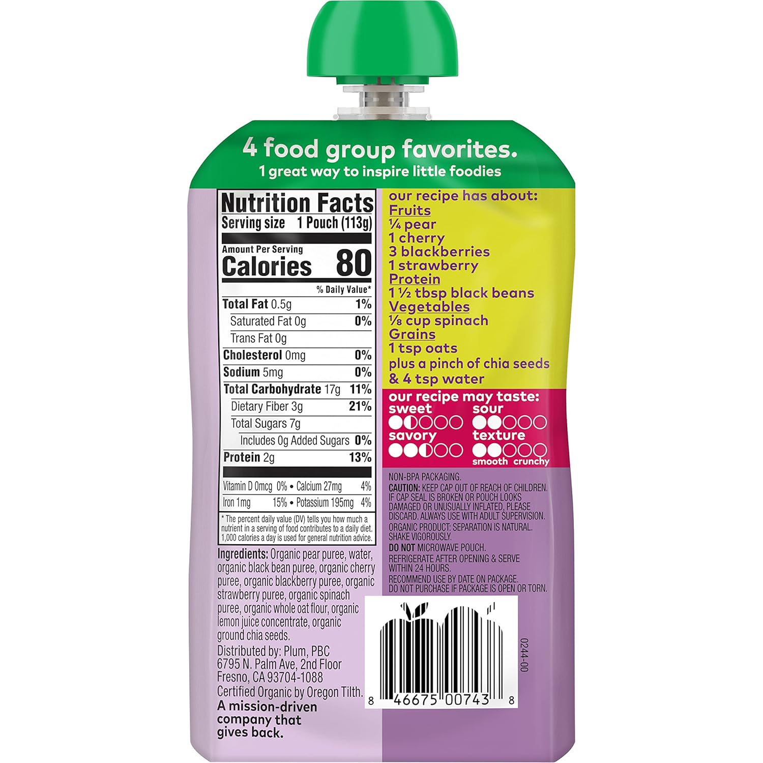 Plum Organics Mighty 4 Organic Toddler Food - Pear, Cherry, Blackberry, Strawberry, Black Bean, Spinach, And Oat - 4 Oz Pouch (Pack Of 6) - Organic Fruit And Vegetable Toddler Food Pouch