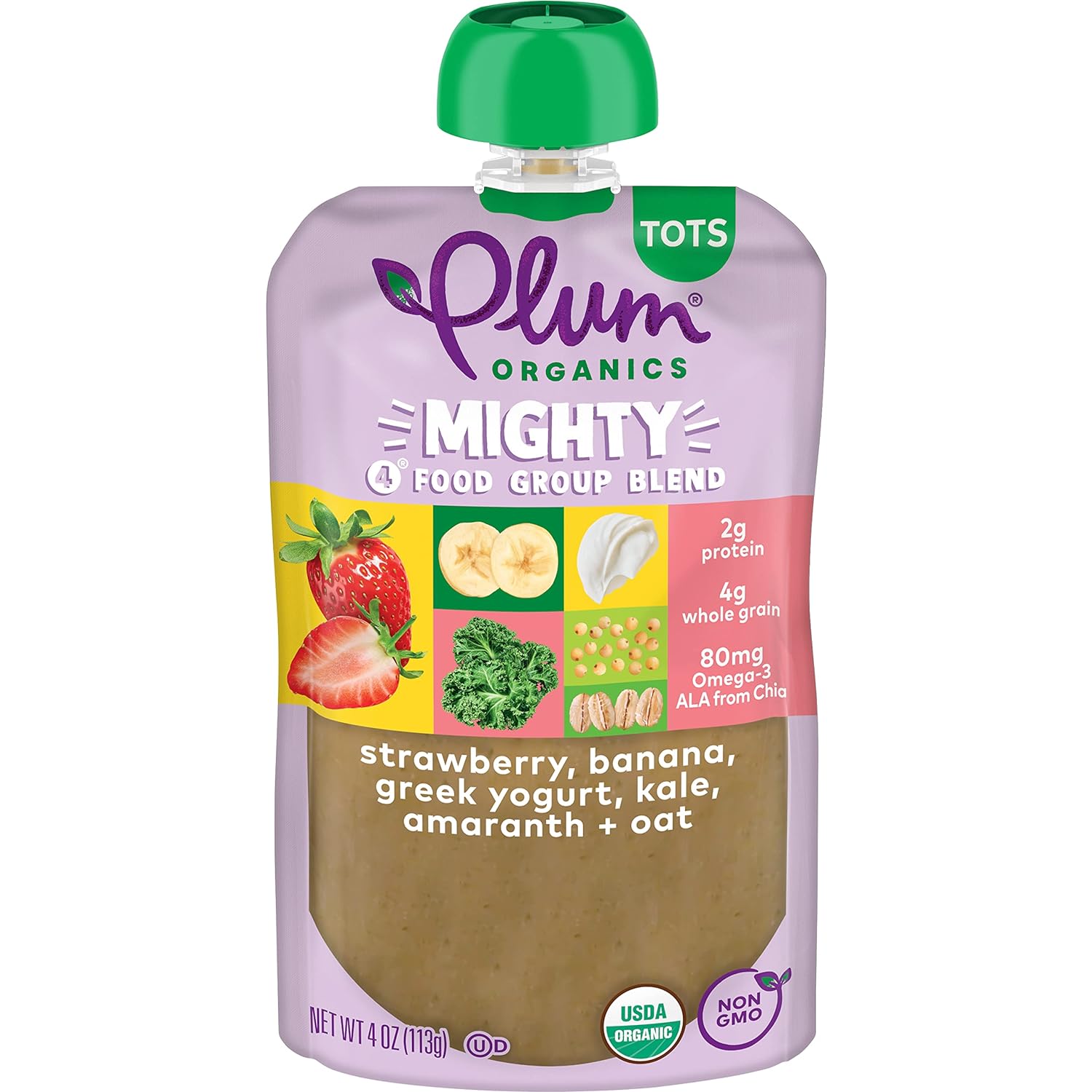 Mighty Blends for a Mighty Toddler. Plum Organics Mighty 4 Blends are filled with essential nutrients from 4 food group favorites - organic fruits, veggies, dairy, and grains - for the perfect snack to fuel your active toddler. Our Strawberry, Banana, Greek Yogurt, Kale, Amaranth, and Oat blend is made with only non-GMO, organic ingredients for an organic toddler food that your toddler will love. Our Plum Organics pouches are always naturally preserved, unsalted, unsweetened, and kosher dairy. And since our baby food pouches are convenient, portable, and resealable, you can customize portion sizes, whether you're at home or you need a simple snack on the goPLUM TODDLER FOOD: Organic toddler food for 12 months and older; Perfect on the go snacks for kidsMADE WITH NATURAL FLAVORS: Contains organic strawberry, organic banana, organic Greek yogurt, organic kale, and organic amaranth and whole oat floursORGANIC TODDLER SNACKS: USDA Organic Certified and Non-GMO blend of fruits, vegetables, dairy, and grains; Unsalted and unsweetenedCONVENIENT TODDLER POUCHES: Plum Organics Mighty 4 Pouches are also available in other flavors