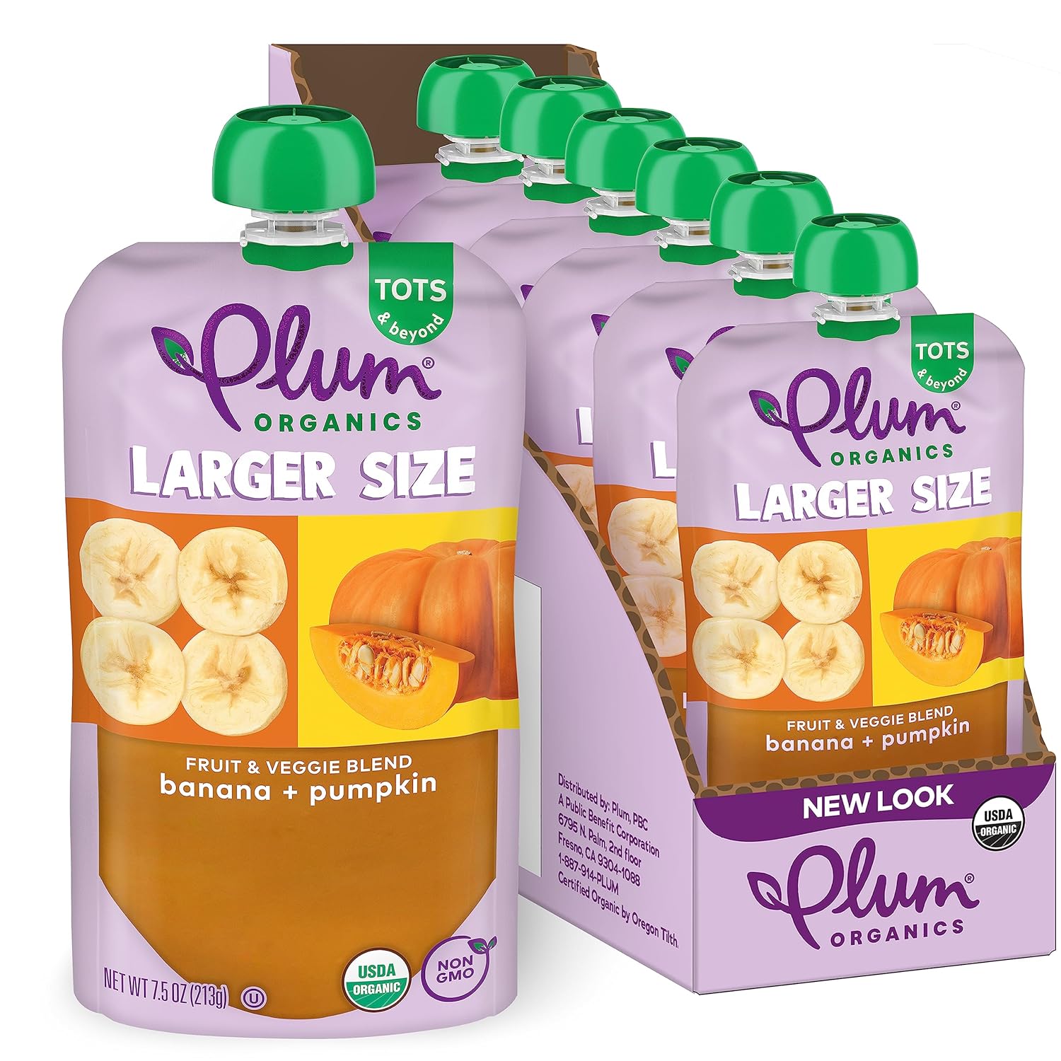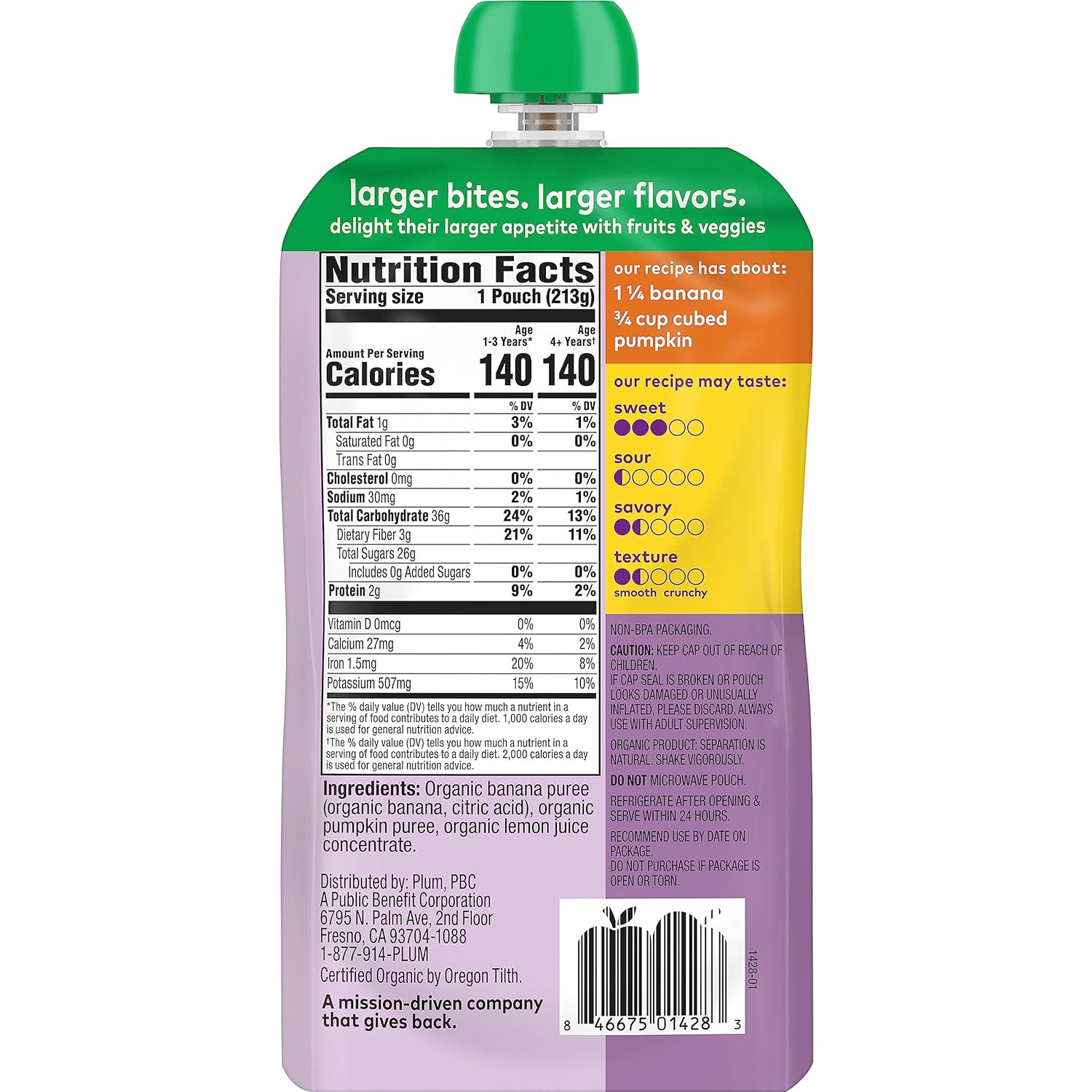 Toddler Food for your Little Foodie. Plum Organics Tots & Beyond (12+ months) organic toddler food pouches are made with blends of whole fruits, veggies, and ingredients that are perfect for exposing your little foodie to unique flavors, textures, and colors earlier. The same flavor combinations your kiddo knows and loves are now available in a bigger 7.5-ounce snack pouch to let them enjoy more of what they love. Our Banana and Pumpkin blend is made with only non-GMO, organic ingredients that your tot will love and you will love giving them. Plum Organics pouches are always naturally preserved, unsalted, unsweetened, and kosher parve. And since our baby food pouches are convenient, portable, and resealable, you can customize portion sizes, whether you're at home or you need a simple snack on the goPLUM TODDLER FOOD: Organic toddler food for 12 months and older; Perfect on the go snacks for kidsMADE WITH NATURAL FLAVORS: Contains organic banana puree, organic pumpkin puree, and organic lemon juice concentrateORGANIC TODDLER SNACKS: USDA Organic Certified and Non-GMO blend of fruits and vegetables; Unsalted and unsweetenedCONVENIENT TODDLER POUCHES: Plum Organics Tots & Beyond Pouches are also available in other flavors