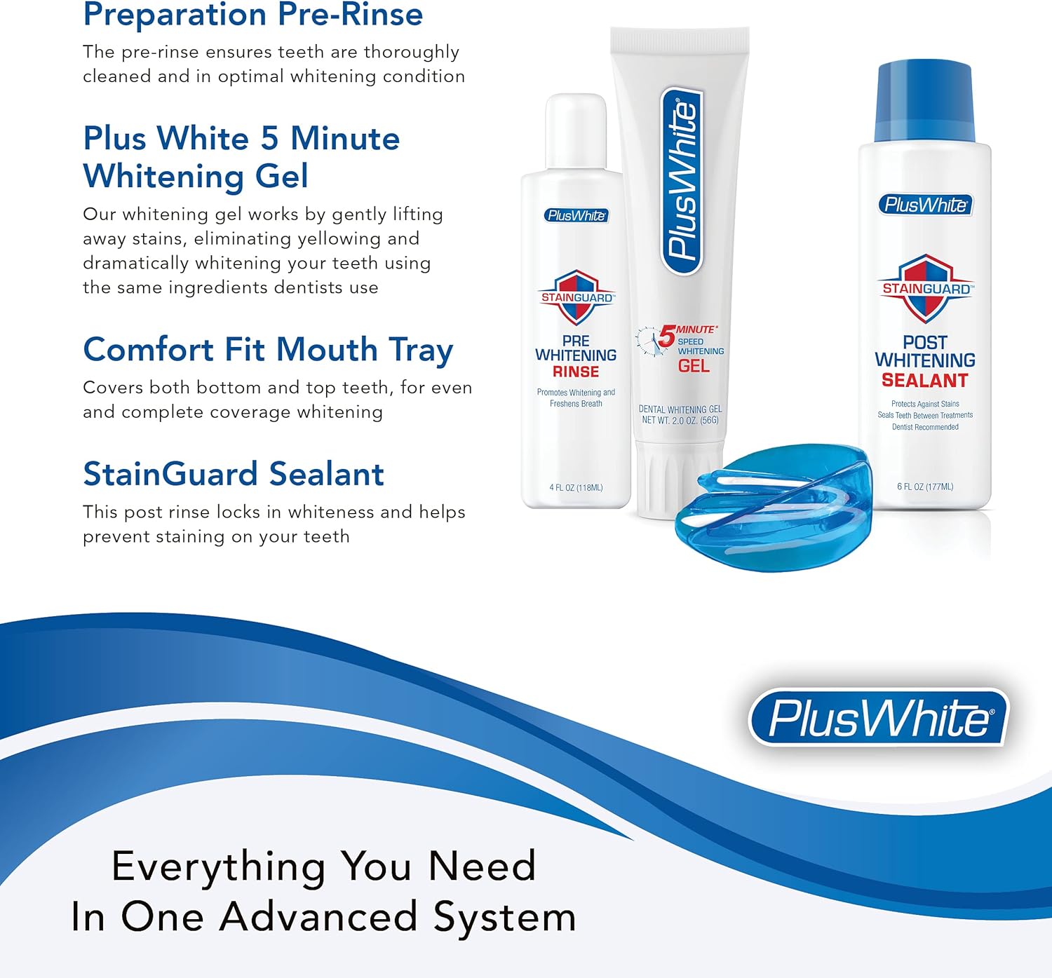 About this item [ Starts Working in 5 Minutes ] - Plus White's Whitening System gets to work in the first 5 minutes of application. Our 5 Minute Speed Whitening Gel uses the same high quality and impressive ingredient dentists use for professional whitening. Using our ComfortFit Mouth Tray for comfortable and easy full coverage, Plus White is a rapid, effective, and non-abrasive at home tooth whitening system. We guaranteed that our whitening gel will takes your smile from dull to dazzling in just minutes. [ Comes with Application Tray for Easy Use ] - Plus White's 5 Minute Speed Whitening Gel is a simple and convenient at home method with proven bleaching power to whiten and brighten teeth in just 5 minutes. Simply squeeze a small, continuous line into the Comfort Fit Mouth Tray which covers both bottom and top teeth, for even and complete coverage whitening. Say goodbye to frustrating whitening strips and hello to the easiest whitening system and hello to easy results. [ Quick, Effective & Professional Whitening at Home ] - Enjoy a dramatically whiter and brighter smile with Plus White's full Whitening System. Our 5 Minute Speed Whitening Gel is non-abrasive and enamel friendly, using the same gentle yet powerful ingredient utilized by dentists. Plus White quickly erases yellow teeth and stains from coffee, wine, smoking and more, and our StainGuard Rinse keeps you protected. With Plus White, you can enjoy a brilliant white smile for half the cost! [ Pre & Post Rinse ] - Your favorite foods and drinks may be the culprit of tinted and stained teeth. To help prepare your teeth for this powerful treatment, we have included a Pre-Rinse. Our StainGuard Post Rinse keeps your teeth pearly white after using our 5 Minute Speed Whitening Gel by locking in whiteness and delaying stains from re-appearing on your teeth. [ How to Use ] - Apply thin continuous line of gel onto Comfort Fit Mouth Tray and follow the directions on box. After allotted time, rinse mouth out with water to remove remaining gel. Followby swishing a cap full of Plus White's StainGuard Post Rinse. Recommended usage: twice daily for 2 weeks, then 1-2x a week for continued maintenance. One, 2 oz needle nose tube, one, application tray and one, 4 oz StainGuard Post Rinse. See more product details,[ Starts Working in 5 Minutes ] - Plus White's Whitening System gets to work in the first 5 minutes of application. Our 5 Minute Speed Whitening Gel uses the same high quality and impressive ingredient dentists use for professional whitening. Using our ComfortFit Mouth Tray for comfortable and easy full coverage, Plus White is a rapid, effective, and non-abrasive at home tooth whitening system. We guaranteed that our whitening gel will takes your smile from dull to dazzling in just minutes,[ Comes with Application Tray for Easy Use ] - Plus White's 5 Minute Speed Whitening Gel is a simple and convenient at home method with proven bleaching power to whiten and brighten teeth in just 5 minutes. Simply squeeze a small, continuous line into the Comfort Fit Mouth Tray which covers both bottom and top teeth, for even and complete coverage whitening. Say goodbye to frustrating whitening strips and hello to the easiest whitening system and hello to easy results,[ Quick, Effective & Professional Whitening at Home ] - Enjoy a dramatically whiter and brighter smile with Plus White's full Whitening System. Our 5 Minute Speed Whitening Gel is non-abrasive and enamel friendly, using the same gentle yet powerful ingredient utilized by dentists. Plus White quickly erases yellow teeth and stains from coffee, wine, smoking and more, and our StainGuard Rinse keeps you protected. With Plus White, you can enjoy a brilliant white smile for half the cost!,[ Pre & Post Rinse ] - Your favorite foods and drinks may be the culprit of tinted and stained teeth. To help prepare your teeth for this powerful treatment, we have included a Pre-Rinse. Our StainGuard Post Rinse keeps your teeth pearly white after using our 5 Minute Speed Whitening Gel by locking in whiteness and delaying stains from re-appearing on your teeth,[ How to Use ] - Apply thin continuous line of gel onto Comfort Fit Mouth Tray and follow the directions on box. After allotted time, rinse mouth out with water to remove remaining gel. Followby swishing a cap full of Plus White's StainGuard Post Rinse. Recommended usage: twice daily for 2 weeks, then 1-2x a week for continued maintenance. One, 2 oz needle nose tube, one, application tray and one, 4 oz StainGuard Post Rinse