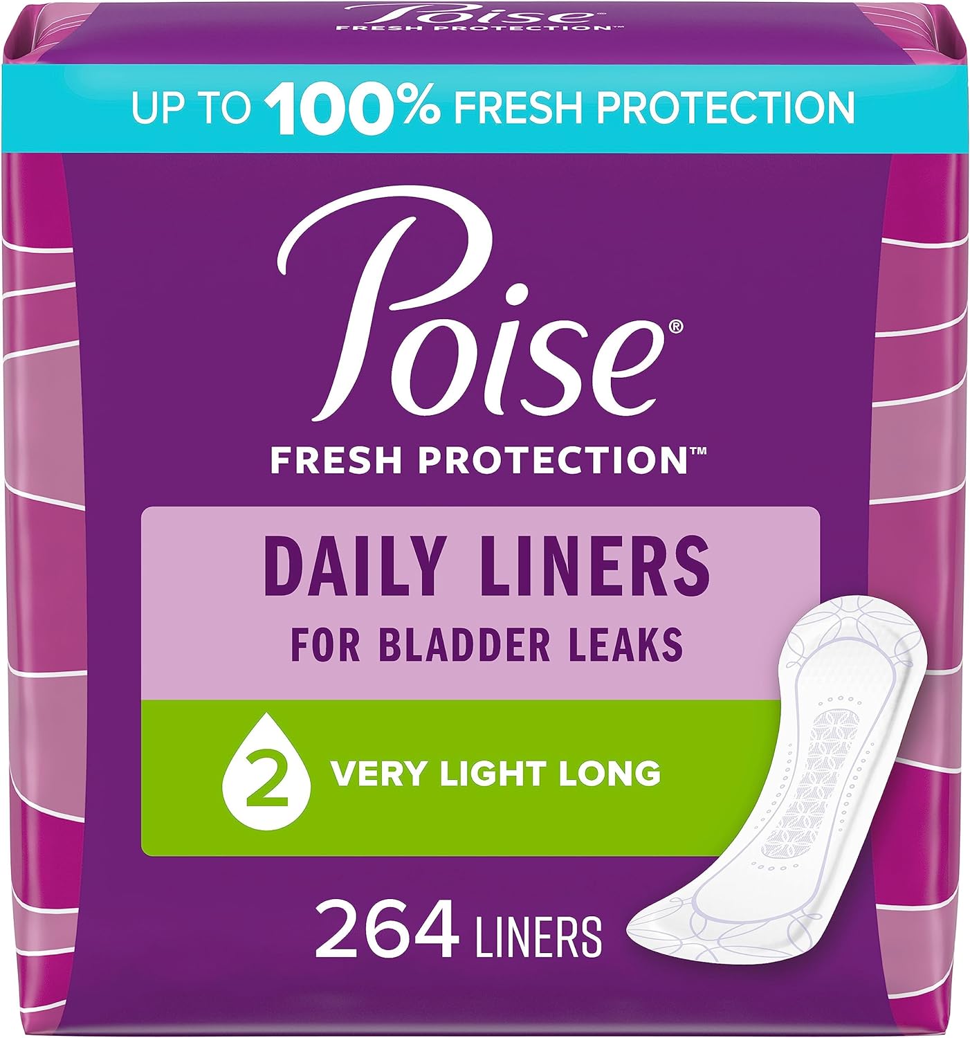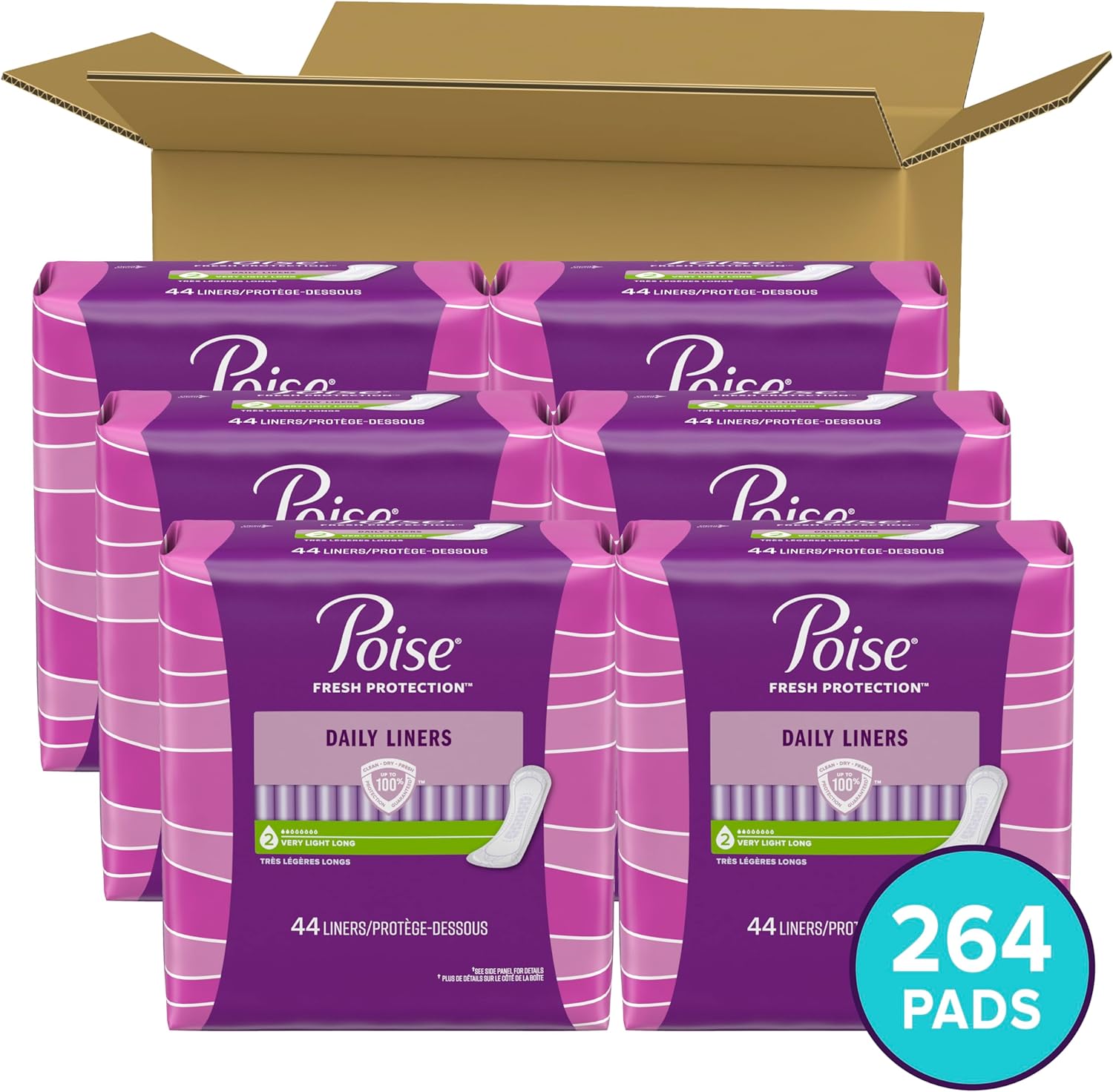 Poise Daily Incontinence Panty Liners, Very Light Absorbency, Long 264 Count (6 Packs of 44 Pantiliners); HSA/FSA-eligible in the U.S. (packaging may vary)Absorbent: helps you avoid leaks and with our Very Light absorbency bladder control panty liners featuring up to 100% Clean Dry Fresh ProtectionStay Dry: remain comfortable throughout the day and help keep wetness away from your skin with an incontinence panty linerāit keeps you 10x drier than the leading period linerOdor Control: always wear Poise discreetly and confidently knowing it instantly locks away wetness and odorComfort: curve-shaped panty liner helps prevent bunchingSay goodbye to discomfort from bladder leaks and hello to a panty liner that is designed for your comfort and protection. Poise incontinence panty liners for women are made specifically for bladder leaks unlike period pads, which are meant for menstrual needs. In fact, Poise liners keep you 10x drier than the leading period liner. They absorb bladder leaks, lock away wetness, and neutralize odors and are also made with breathable materials that help eliminate dampness, so you feel clean and fresh too! Poise bladder control panty liners are discreet and fit securely in your underwear. Our incontinence panty liners are available in Very Light absorbency, and Poise microliners are available in lightest absorbency. For heavier absorbency needs, check out Poise Incontinence pads. Shop for Poise discreetly by having it shipped directly to your door or pick up curbside. Poise adult incontinence products are HSA/FSA-eligible in the U.S. *Satisfaction guaranteed or your money back: Online access required. Limit 1 per household. Original receipt/UPC required. Restrictions apply. See Poise website for details