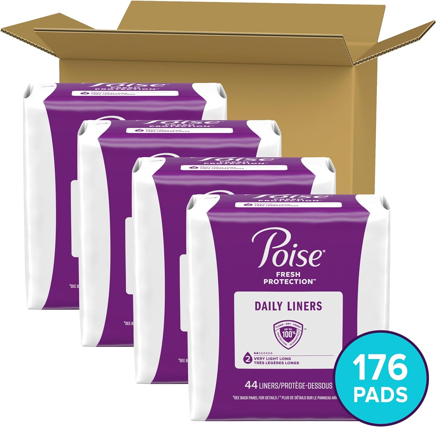 Poise Daily Liners, Incontinence Panty Liners, 2 Drop Very Light Absorbency, Long Length, 176 Count Of Pantiliners (4 Packs Of 44), Packaging May Vary