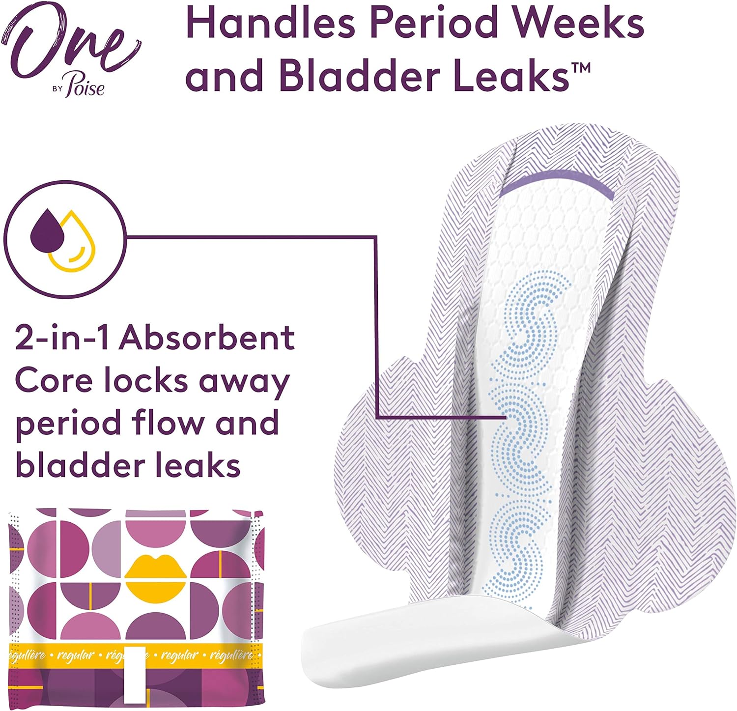 NEW One by Poise ultra thin feminine pads with wings: featuring a 2-in-1 absorbent core designed specifically to lock away period flow AND bladder leaks in one convenient; discreet; comfortable padWomenâs pad absorbs instantly; staying 10X drier* and provides odor control so you can feel dry; fresh and comfortable every day of the monthUnique 2-in-1 pad for women keeps you protected from all your leaks; all in one menstrual & bladder control pad; thanks to the Dual Leakblock System with stay-in-place-wings and leakblock sidesGreat for postpartum/maternity use and every day freshness; HSA/FSA-eligible in the U.S22 ultra thin regular pads with wings; One by Poise Pads for Women are made without fragrances; Packaging may vary from images shownOne by Poise is the dual use ultra thin feminine pad youâve been waiting for! Featuring a 2-in-1 absorbent core designed specifically to lock away period flow and bladder leaks. This is your all-in-one pad with the all-in-one protection you deserve. Perfect for women who need a menstrual pad and a bladder control pad. One by Poise Pads for women stays 10X drier* and provide odor control so you can feel dry, fresh and comfortable every day of the month. Great for use as a postpartum pad or maternity pad. The 2-in-1 quick absorbing pad has a unique Dual Leakblock System with stay-in-place wings and leakblock sides, providing you protection from all your leaks, all in one convenient pad. One by Poise Pads for Women are HSA/FSA-eligible in the U.S. Pads always ship in a discreet box, directly to your door. Packaging may from images shown.*for bladder leaks vs leading period pad