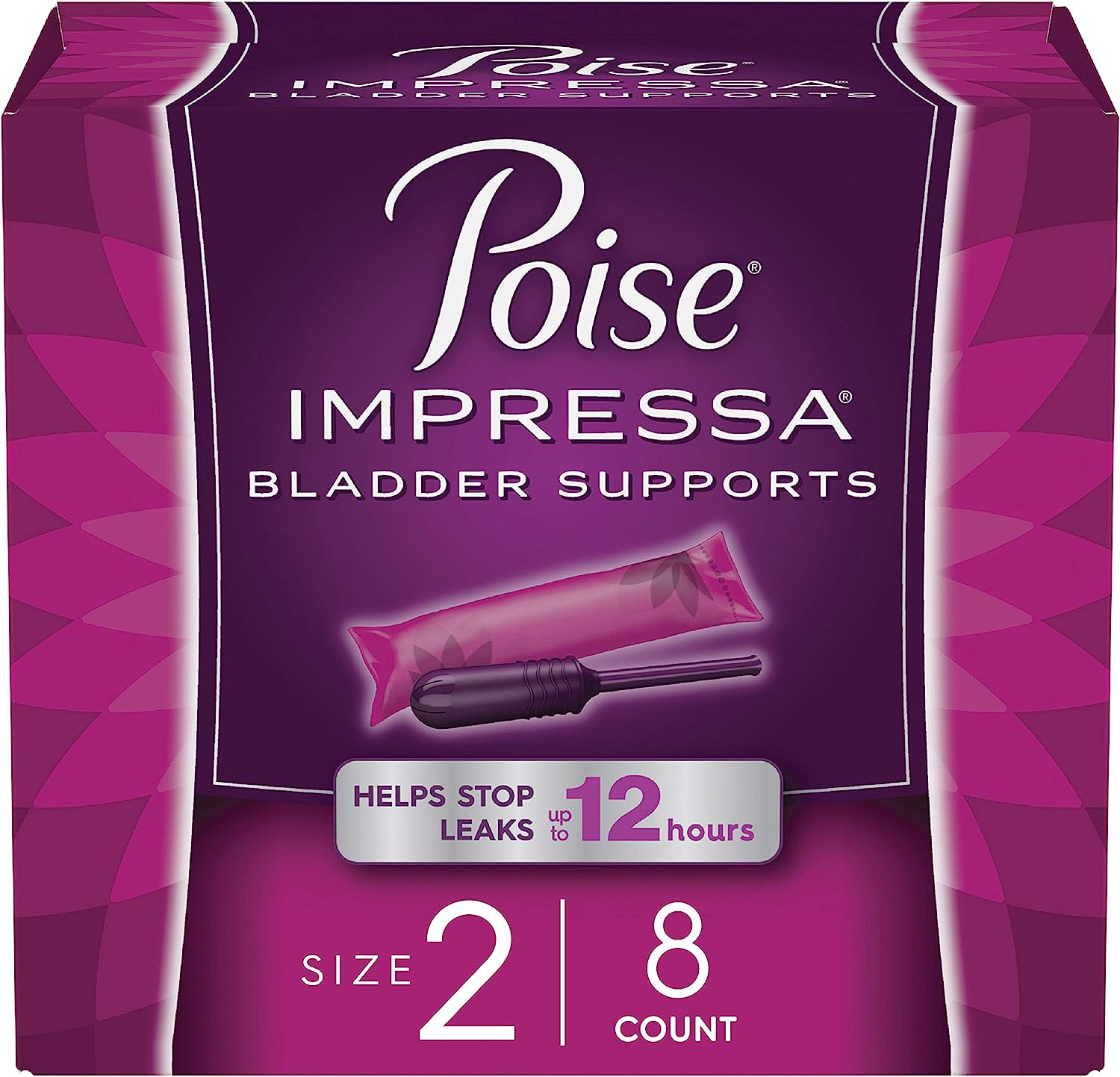 Poise Impressa Bladder Supports, Size 2, are a comfortable, discreet alternative to incontinence padsWorn internally, like a tampon, Impressa gently lifts and supports the urethra to help stop leaks associated with bladder incontinencePerfect for resolving bladder leakage and pelvic floor dysfunction to improve bladder controlImpressa bladder supports help stop leaks before they happen; may be worn for up to 12 hours in a 24-hour periodIf new to Impressa, start with the Sizing Kit to find the best fit and leak control; Gynecologist-tested and FSA-eligible in the U.S.; Packaging may varyAs a woman always on the go, you need a revolutionary incontinence product that keeps up with your active lifestyle. Poise Impressa Bladder Supports are a comfortable alternative to incontinence pads for women that protects you from bladder leaks before they happen. If you experience overactive bladder when you laugh, cough, sneeze, run or swim β known as Stress Urinary Incontinence (SUI) β Impressa Bladder Supports are for you! Insert Impressa easily into the vagina, like a tampon, to gently lift and support the urethra and to stop bladder leakage while allowing you to use the bathroom as usual. Whether you are running on the treadmill, running errands or running after kids, Impressa provides a comfortable, disposable incontinence solution that eliminates the need for bulky bladder control pads. Poise Impressa can be worn for up to 12 hours within a 24-hour period.Don't know where to start Try the Poise Impressa Sizing Kit which includes all three sizes, one of each size. Impressa always ships in a discreet box