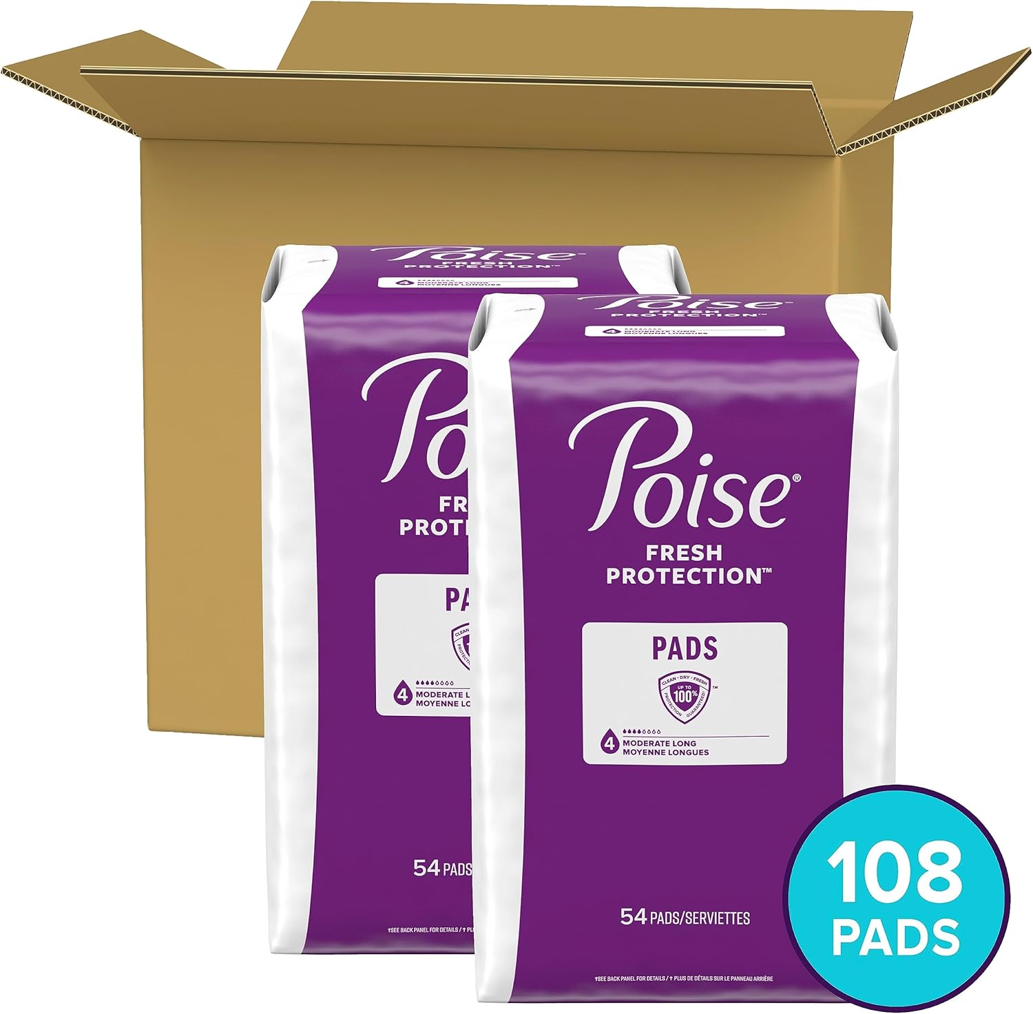 Poise Incontinence Pads: 108 Postpartum And Incontinence Pads, 4 Drop Moderate Absorbency, Long Length (108 Pads Total); Hsa/Fsa Eligible; Packaging May Vary