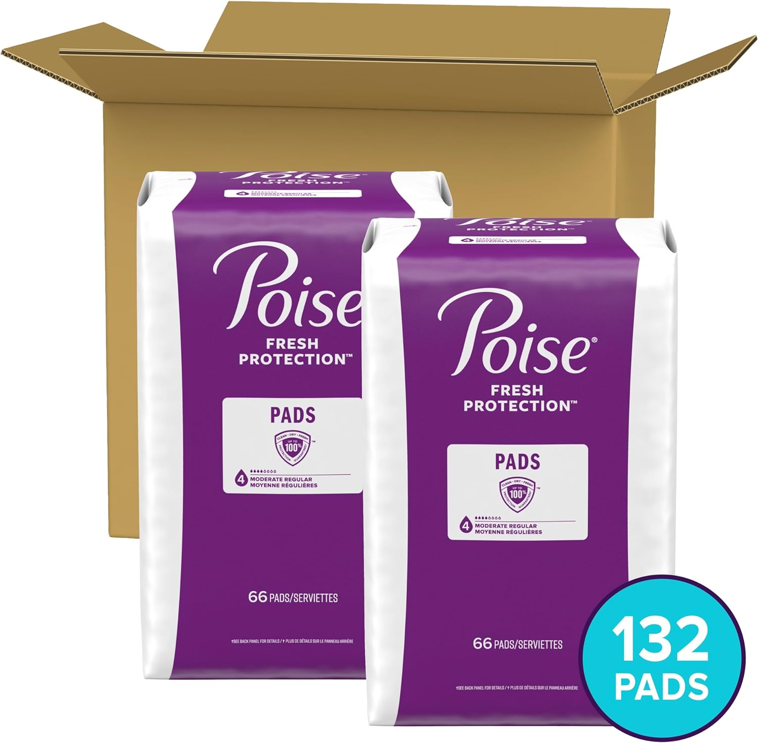Moderate Absorbency 4 Drop: Poise Postpartum Incontinence Pads, Moderate Absorbency, Regular Length 132 pads (2 packs of 66); HSA/FSA-eligible in the U.S. (packaging may vary)Absorbent: helps you avoid leaks with Moderate Absorbency bladder control pads featuring up to 100% Clean Dry Fresh ProtectionStay Dry: remain comfortable throughout the day and help keep wetness away from your skin—it keeps you 10x drier than the leading period padOdor Control: always wear Poise discreetly and confidently knowing it instantly locks away wetness and odorComfort: curve-shaped pad with contour helps prevents bunching and features a wider front and back for secure incontinence protectionSay goodbye to discomfort from bladder leaks and hello to Poise Postpartum Incontinence Pads in 4 Drop Moderate Absorbency and Regular Length, a pad that is designed for your comfort and protection. Poise incontinence pads for women are made specifically for bladder leaks, unlike period pads, which are meant for menstrual needs. In fact, Poise pads keep you 10x drier compared to the leading period pad. Poise pads absorb bladder leaks, lock away wetness, and neutralize odors, helping you feel clean and fresh throughout the day. Our pads are also made with breathable materials that help eliminate dampness, so you feel clean and fresh too! Poise bladder control pads are discreet and fit securely in your underwear. Poise incontinence pads are available in light, moderate, maximum, ultra, and overnight absorbencies. For lighter absorbency needs, check out Poise Daily Liners. Shop for Poise discreetly by having it shipped directly to your door or pick up curbside. Poise adult incontinence products are HSA/FSA-eligible in the U.S. *Satisfaction guaranteed or your money back: Online access required. Limit 1 per household. Original receipt/UPC required. Restrictions apply. See Poise website for details