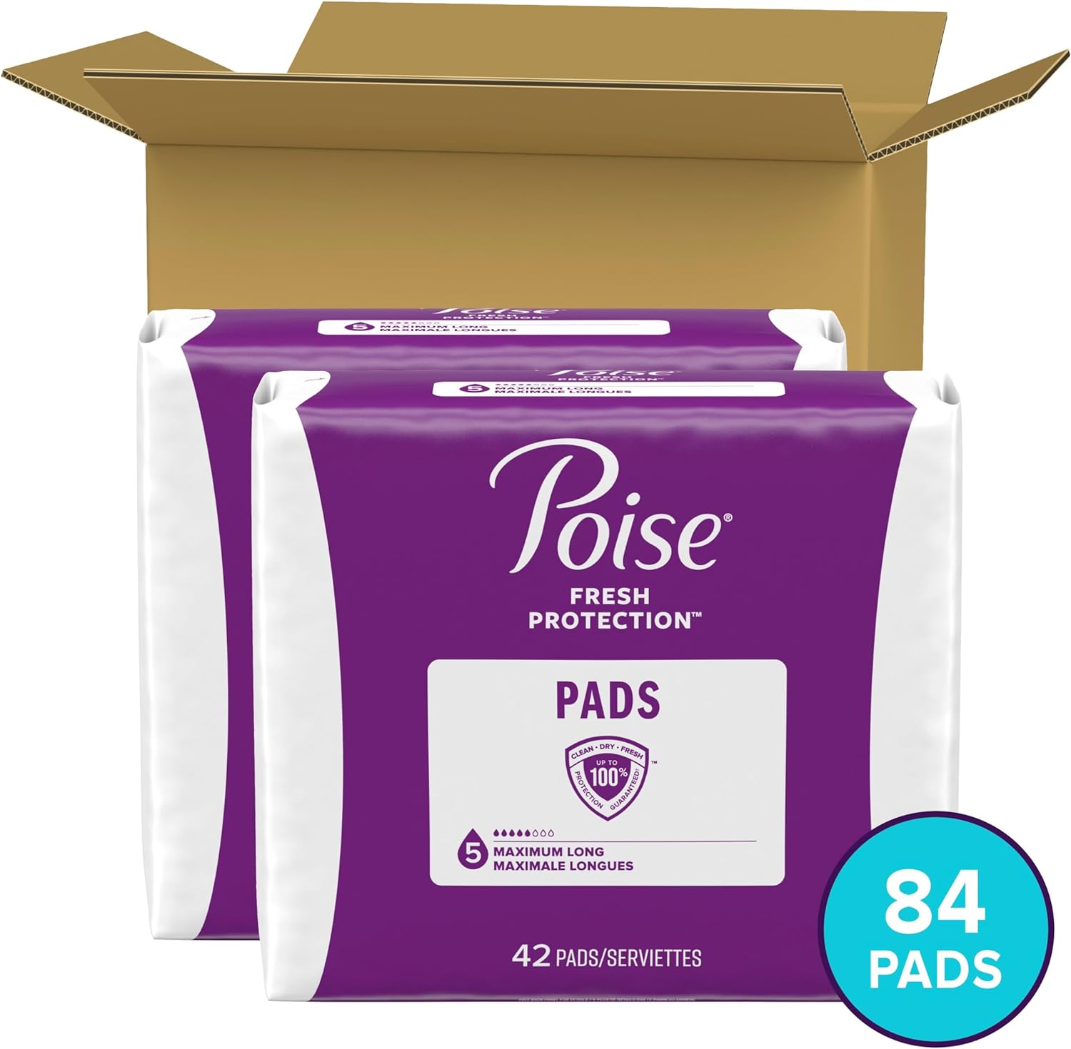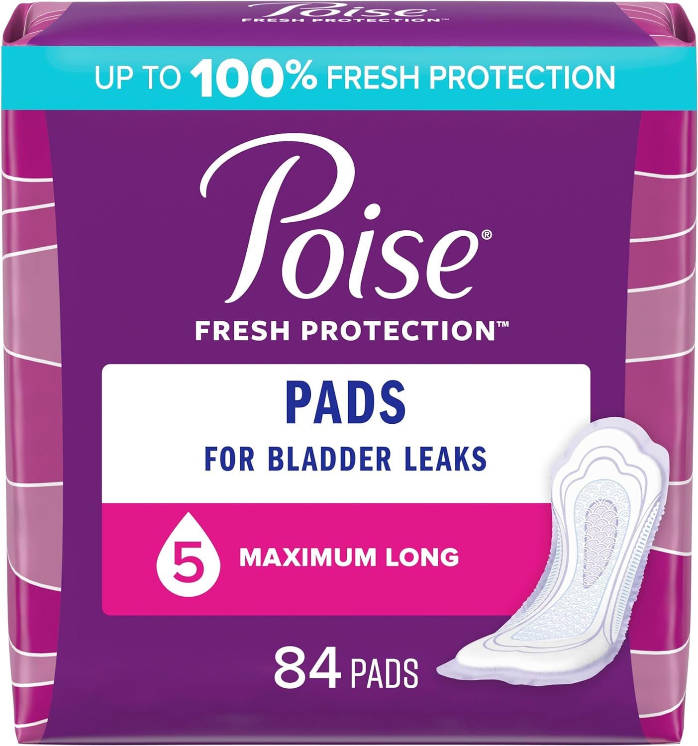 Maximum Absorbency 5 Drop: Poise Postpartum Incontinence Pads, Maximum Absorbency, Long Length 84 pads (2 packs of 42); HSA/FSA-eligible in the U.S. (packaging may vary)Absorbent: helps you avoid leaks with Maximum Absorbency bladder control pads featuring up to 100% Clean Dry Fresh ProtectionStay Dry: remain comfortable throughout the day and help keep wetness away from your skin—it keeps you 10x drier than the leading period padOdor Control: always wear Poise discreetly and confidently knowing it instantly locks away wetness and odorComfort: curve-shaped pad with contour helps prevents bunching and features a wider front and back for secure incontinence protectionSay goodbye to discomfort from bladder leaks and hello to Poise Postpartum Incontinence Pads in 5 Drop Maximum Absorbency and Long Length, a pad that is designed for your comfort and protection. Poise incontinence pads for women are made specifically for bladder leaks, unlike period pads, which are meant for menstrual needs. In fact, Poise pads keep you 10x drier compared to the leading period pad. Poise pads absorb bladder leaks, lock away wetness, and neutralize odors, helping you feel clean and fresh throughout the day. Our pads are also made with breathable materials that help eliminate dampness, so you feel clean and fresh too! Poise bladder control pads are discreet and fit securely in your underwear. Poise incontinence pads are available in light, moderate, maximum, ultra, and overnight absorbencies. For lighter absorbency needs, check out Poise Daily Liners. Shop for Poise discreetly by having it shipped directly to your door or pick up curbside. Poise adult incontinence products are HSA/FSA-eligible in the U.S. *Satisfaction guaranteed or your money back: Online access required. Limit 1 per household. Original receipt/UPC required. Restrictions apply. See Poise website for details