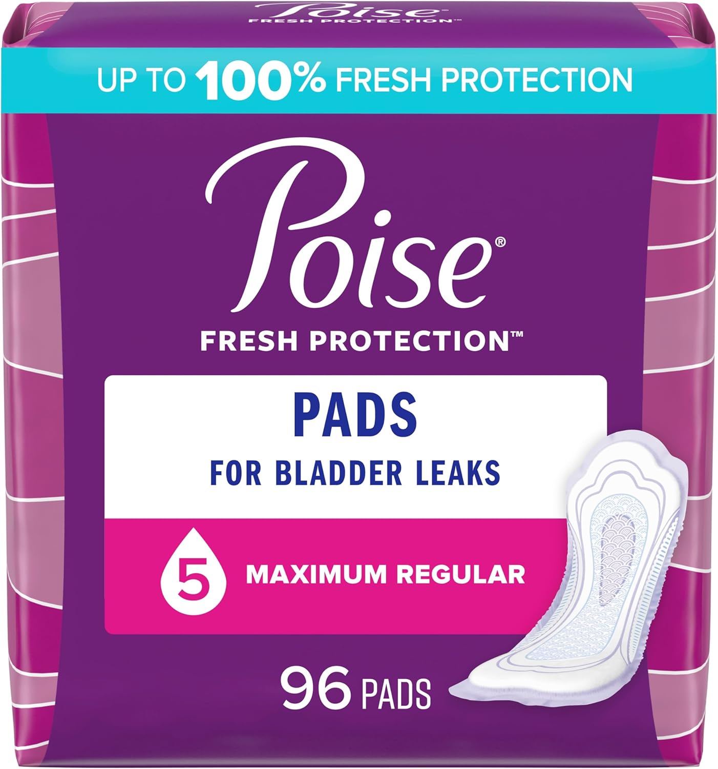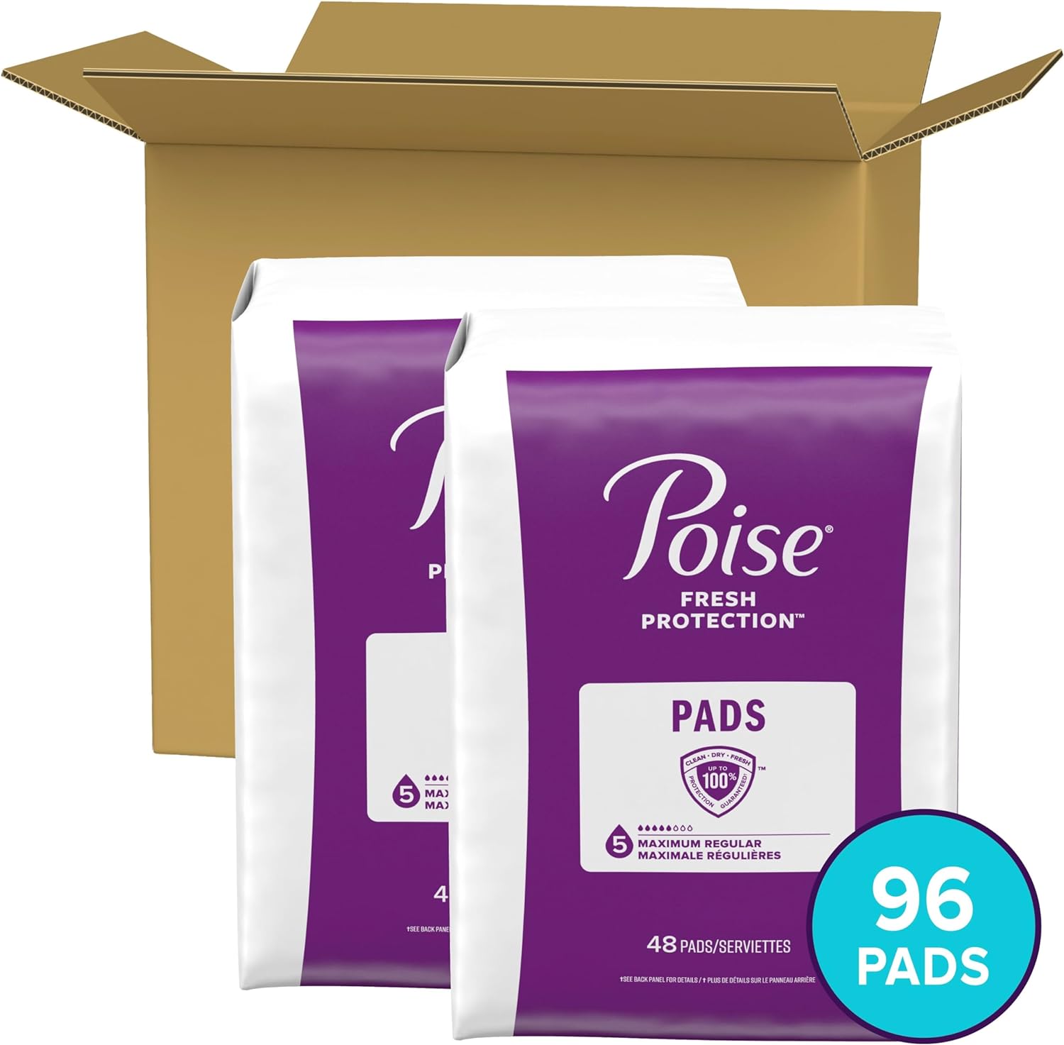 Maximum Absorbency 5 Drop: Poise Postpartum Incontinence Pads, Maximum Absorbency, Regular Length 96 pads (2 packs of 48); HSA/FSA-eligible in the U.S. (packaging may vary)Absorbent: helps you avoid leaks with Maximum Absorbency bladder control pads featuring up to 100% Clean Dry Fresh ProtectionStay Dry: remain comfortable throughout the day and help keep wetness away from your skin—it keeps you 10x drier than the leading period padOdor Control: always wear Poise discreetly and confidently knowing it instantly locks away wetness and odorComfort: curve-shaped pad with contour helps prevents bunching and features a wider front and back for secure incontinence protectionSay goodbye to discomfort from bladder leaks and hello to Poise Postpartum Incontinence Pads in 5 Drop Maximum Absorbency and Regular Length, a pad that is designed for your comfort and protection. Poise incontinence pads for women are made specifically for bladder leaks, unlike period pads, which are meant for menstrual needs. In fact, Poise pads keep you 10x drier compared to the leading period pad. Poise pads absorb bladder leaks, lock away wetness, and neutralize odors, helping you feel clean and fresh throughout the day. Our pads are also made with breathable materials that help eliminate dampness, so you feel clean and fresh too! Poise bladder control pads are discreet and fit securely in your underwear. Poise incontinence pads are available in light, moderate, maximum, ultra, and overnight absorbencies. For lighter absorbency needs, check out Poise Daily Liners. Shop for Poise discreetly by having it shipped directly to your door or pick up curbside. Poise adult incontinence products are HSA/FSA-eligible in the U.S. *Satisfaction guaranteed or your money back: Online access required. Limit 1 per household. Original receipt/UPC required. Restrictions apply. See Poise website for details
