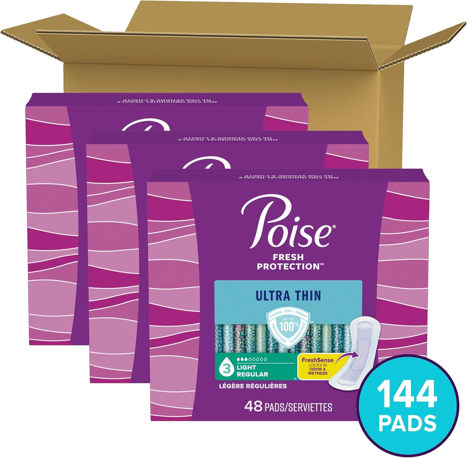 Poise Ultra Thin Incontinence Pads: 144 Postpartum And Incontinence Pads (3 Packs Of 48), 3 Drop Light Absorbency, Regular Length; Hsa/Fsa-Eligible; Packaging May Vary
