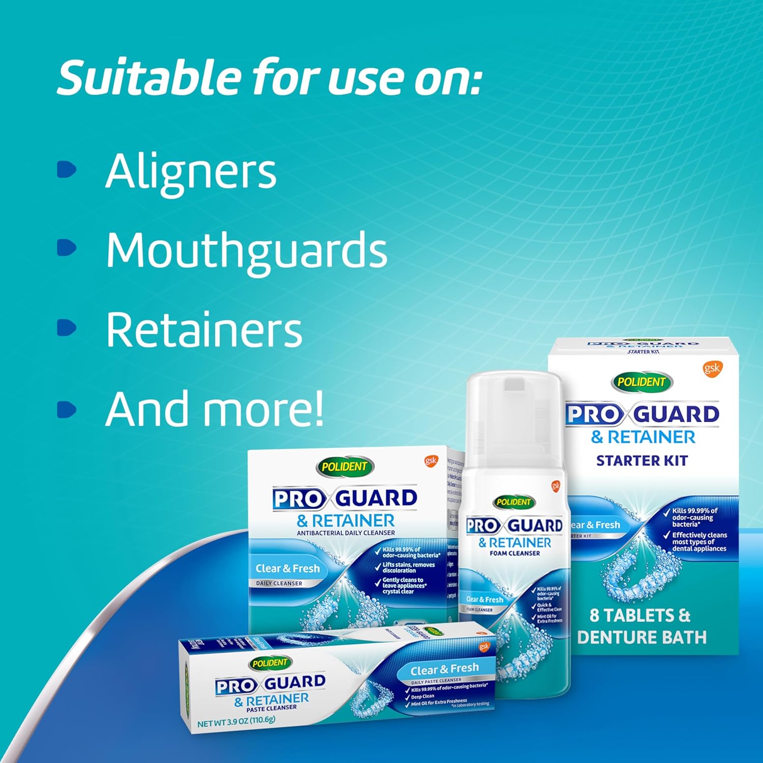 Polident Proguard & Retainer Cleaning Tablets (Mouth Guard Cleaner, Aligner Cleanser And Retainer Cleaner Tablets) Will Help Keep Your Removable Oral Appliance Clean And Crystal Clear. This Gentle, Non-Abrasive Daily Clear Retainer Cleaner Kills 99.99% Of Odor-Causing Germs And Gently Lifts Stains And Removes Discoloration From Most Dental Appliances. Featuring Crystal Clear Technology, This Retainer Cleaner Will Keep Your Appliance Clear And Transparent. In Laboratory Tests, These Daily Mouth Guard Cleaner Tablets Kill 99.9% Of Odor-Causing Germs To Help Keep Your Appliance Clean, Reducing Your Risk Of Gum Irritation And Soreness. These Mouth Guard Tablets Are Suitable For Use On Orthodontic Retainers, Mouth Guards, Night Guards, Acrylic Splints And Sports Guards. The Refreshing Minty Aroma Keeps Your Dental Appliances Fresh When Used As Directed. As Part Of Your Daily Mouth Guard Or Retainer Care Routine, Simply Drop One Of These Daily Retainer Cleanser Tablets Into Warm Water, Soak Your Dental Appliance For Three To Five Minutes, Then Brush With A Soft Brush And Rinse Thoroughly. Use Proguard & Retainer Antibacterial Daily Cleanser Tablets And Show Off Your Smile Confidently