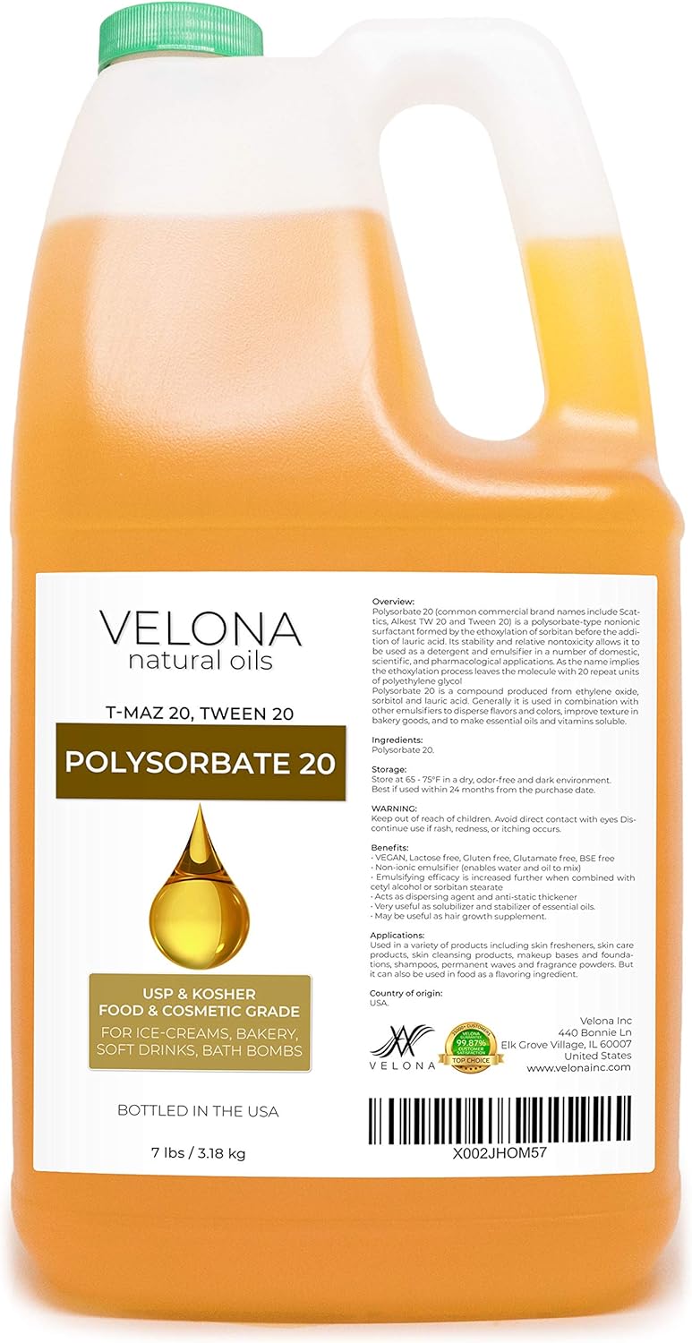 Polysorbate 20 by Velona - 1 Gallon / 128 Fl Oz | Solubilizer, Food & Cosmetic Grade | All Natural for Cooking, Skin Care and Bath Bombs | Use Today - Enjoy Results