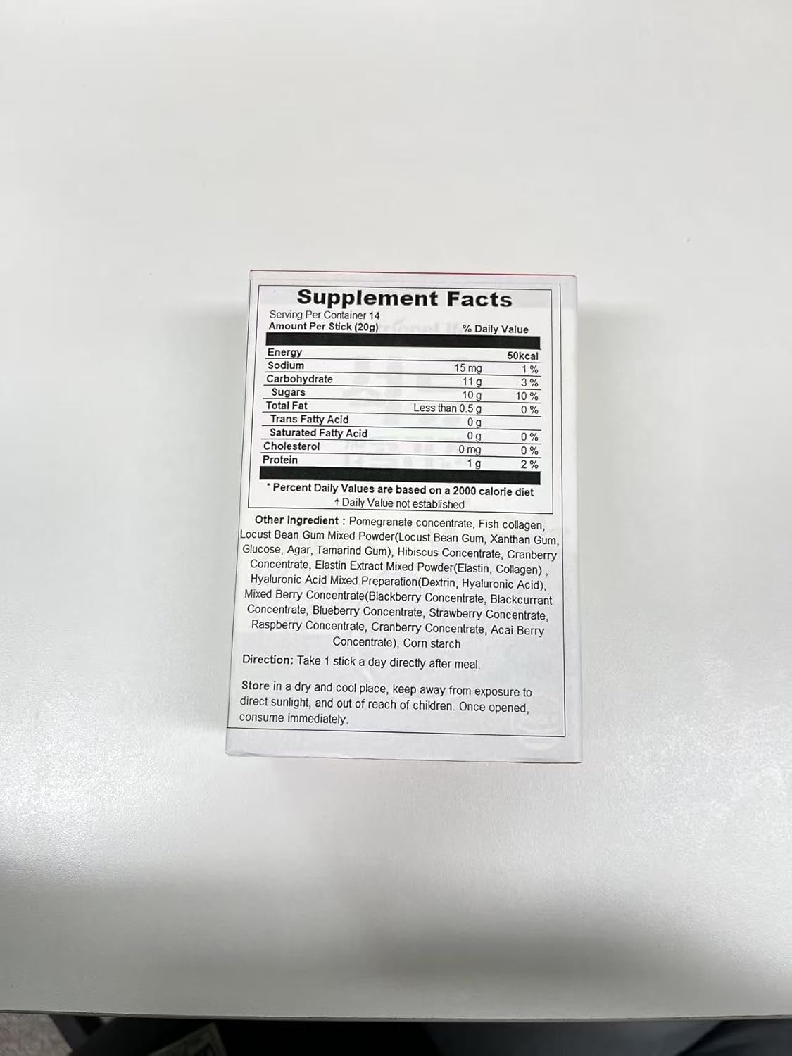 About this item HIGH-PURITY POMEGRANATE EXTRACT: Contains 18,579 mg of pomegranate extract from Spain, standardized to 92.896% purity. Known for its antioxidant properties. COLLAGEN-RICH FORMULA: Each stick provides 1000 mg of low molecular weight fish collagen (1000 Da), which may support skin firmness and texture. SUPPORT FOR SKIN HEALTH: Includes hyaluronic acid to assist with moisture retention and elastin to support skin structure and elasticity. ANTIOXIDANT INGREDIENTS: Formulated with hibiscus, cranberry, and a blend of seven berry extracts to provide antioxidant support. CONVENIENT DAILY USE: Comes in a tasty jelly format. Recommended serving is 1-2 sticks per day for a simple and enjoyable addition to your beauty routine. › See more product details,HIGH-PURITY POMEGRANATE EXTRACT: Contains 18,579 mg of pomegranate extract from Spain, standardized to 92.896% purity. Known for its antioxidant properties,COLLAGEN-RICH FORMULA: Each stick provides 1000 mg of low molecular weight fish collagen (1000 Da), which may support skin firmness and texture,SUPPORT FOR SKIN HEALTH: Includes hyaluronic acid to assist with moisture retention and elastin to support skin structure and elasticity,ANTIOXIDANT INGREDIENTS: Formulated with hibiscus, cranberry, and a blend of seven berry extracts to provide antioxidant support,CONVENIENT DAILY USE: Comes in a tasty jelly format. Recommended serving is 1-2 sticks per day for a simple and enjoyable addition to your beauty routine