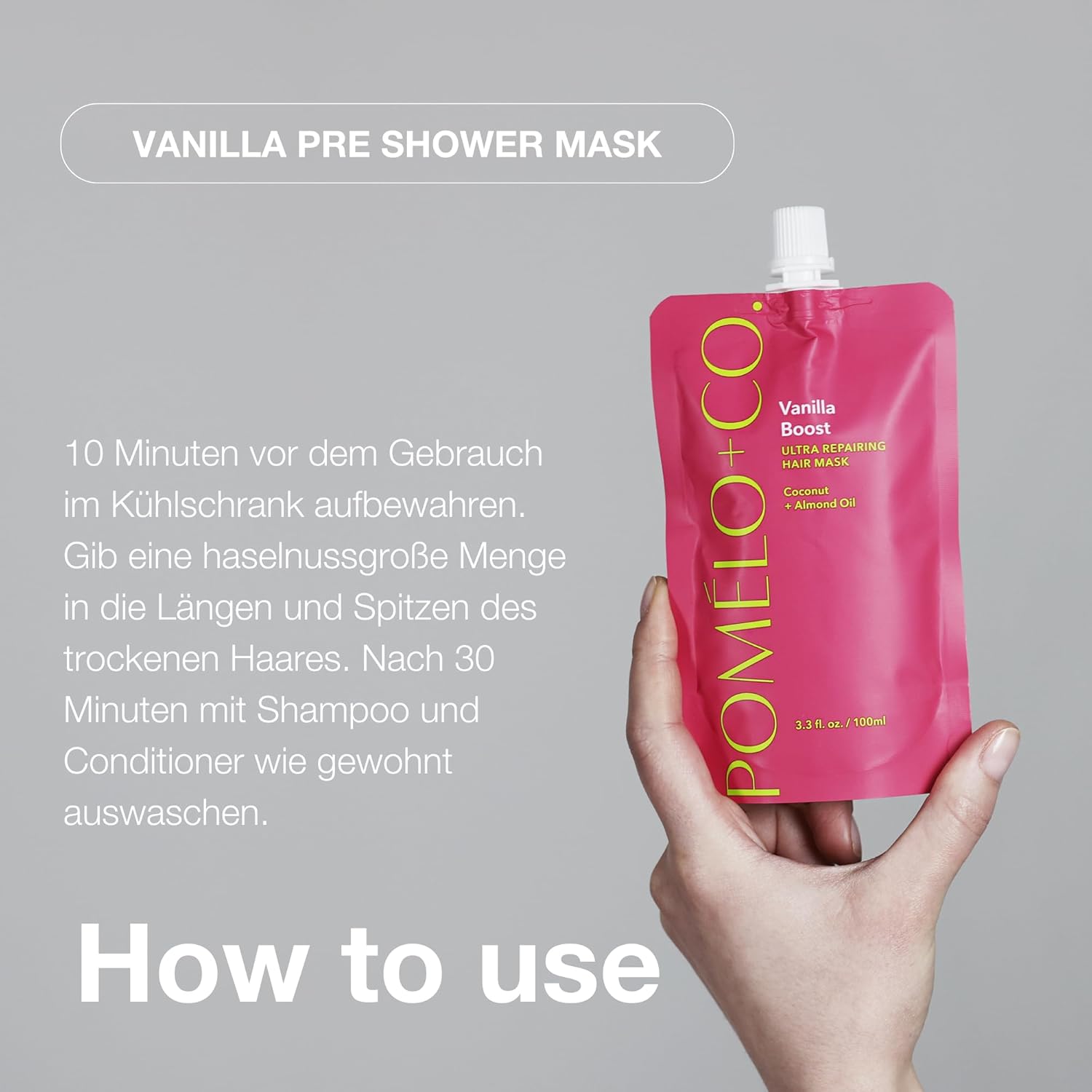 Product description FROM STRESS TO BLESSED Pamper your hair with the ultimate repair ritual. Directions Bye-bye dry hair - the Pomélo+Co. Vanilla Boost Hair Mask puts an end to brittle and damaged hair! 1. Apply the hair mask to damp hair. 2. Leave the hair mask for 10-15 minutes. 3. Rinse the hair mask thoroughly. 4. Use the hair mask 1-2 times a week,Vanilla Boost Pre-Shower Repair Mask designed to revitalize and strengthen dry and damaged hair. With a blend of vitamin E, argan oil and avocado oil, this mask deeply nourishes and leaves a protective shield to prevent future damage. Hair is soothed, frizz reduced and bright shine for irresistibly smooth and healthy-looking hair,Ingredient 1 - Vitamin E has moisturizing properties that can prevent dryness and flaking of the scalp. The antioxidant properties of tocopheryl acetate also play a role in protecting the scalp from environmental damage, helping to maintain the overall well-being of the scalp and hair,Ingredient 2 - Argan oil: it is rich in essential fatty acids, vitamin E and antioxidants that moisturize and nourish the hair strands, promoting shine, softness and manageability. In addition, its anti-inflammatory properties soothe the the scalp, relieving irritation and dryness, while antioxidants help protect hair from environmental damage, making it stronger and healthier looking,Ingredient 3 - Avocado Oil: It is known for its nourishing and moisturizing properties. Contains a high concentration of monounsaturated fats, vitamins E and C and antioxidants. It can help moisturize and strengthen hair, reducing frizz and improving shine,Product Benefits: - Seals hydration - Strengthens - Protection against damage - More shine and volume