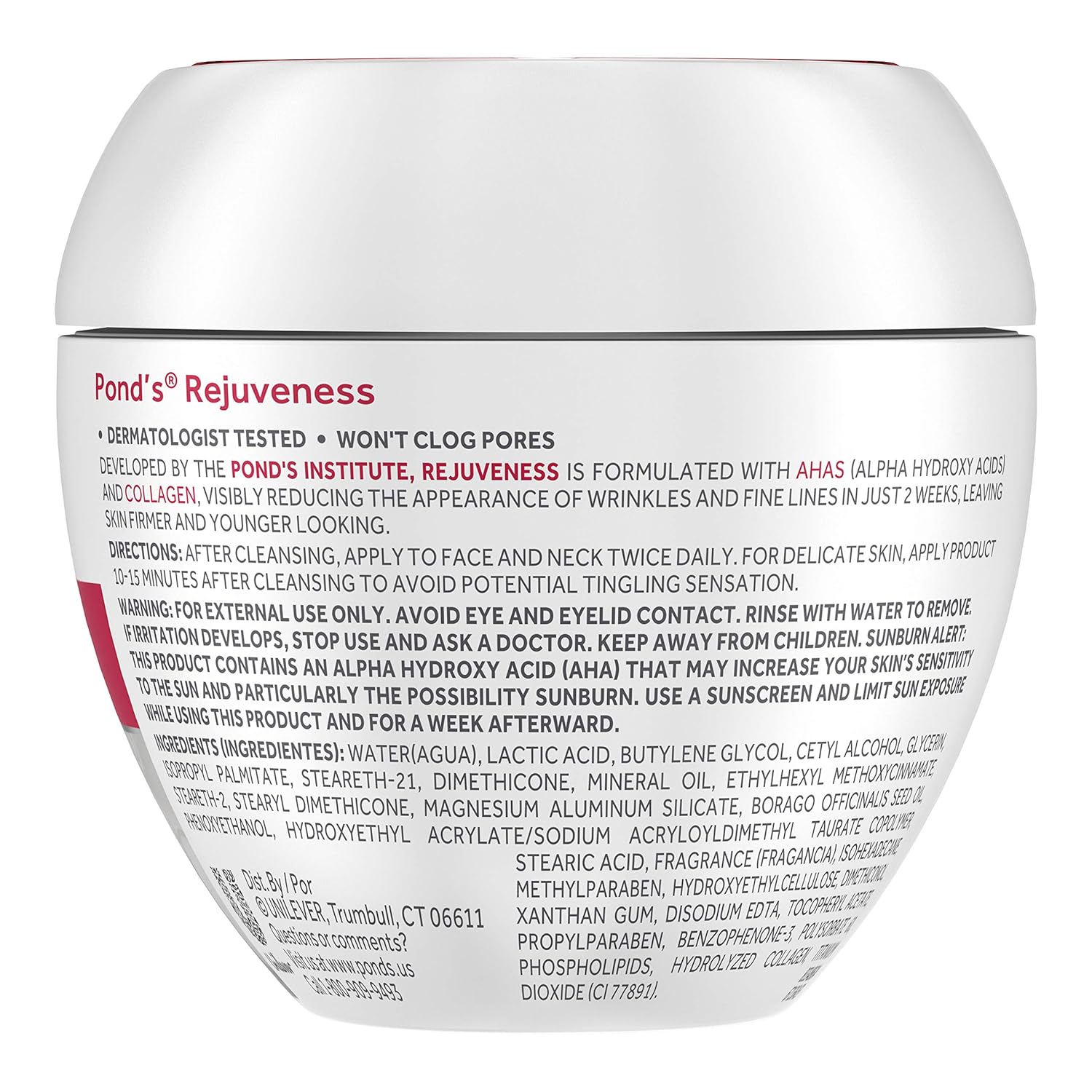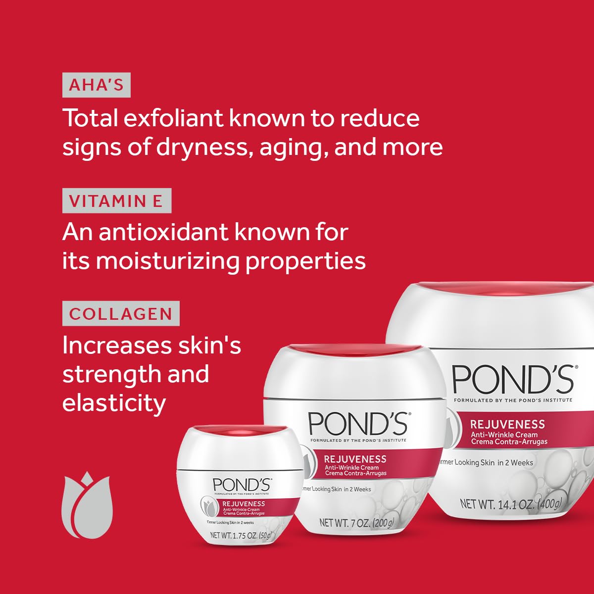 About this item Visibly reduce the appearance of wrinkles and fine lines in just 2 weeks with the power of POND'S Rejuveness Anti- Aging Face Moisturizer An advanced skin-firming formula. Made with Alpha Hydroxy Acids to gently remove dull surface skin cells and smooth the appearance of fine lines Rich in skin-smoothing essentials. Infused with Collagen and Vitamin E to nourish skin and strengthen elasticity Powered by the best of science and technology. Hypoallergenic and dermatologist tested, our anti-wrinkle facial moisturizer is specially formulated to firm and smooth skin without causing irritation Trust in a timeless classic. Experience the magic of a brand that has stood the test of time, delivering soft, smooth, and radiant skin for over 170 years See more product details,Visibly reduce the appearance of wrinkles and fine lines in just 2 weeks with the power of POND'S Rejuveness Anti- Aging Face Moisturizer,An advanced skin-firming formula. Made with Alpha Hydroxy Acids to gently remove dull surface skin cells and smooth the appearance of fine lines,Rich in skin-smoothing essentials. Infused with Collagen and Vitamin E to nourish skin and strengthen elasticity,Powered by the best of science and technology. Hypoallergenic and dermatologist tested, our anti-wrinkle facial moisturizer is specially formulated to firm and smooth skin without causing irritation,Trust in a timeless classic. Experience the magic of a brand that has stood the test of time, delivering soft, smooth, and radiant skin for over 170 years