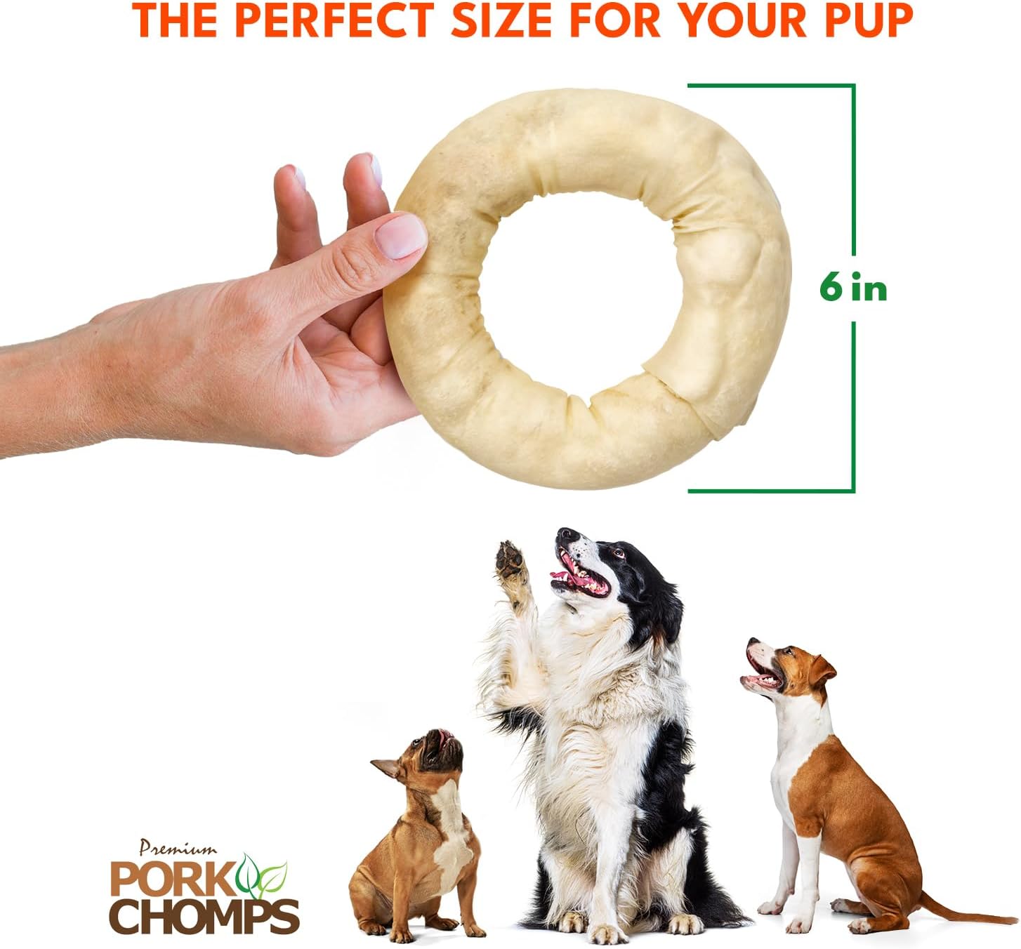 Premium Pork Chomps 6” Baked Bagels Are Fully Digestible And The Perfect Rawhide Alternative For Your Pup!! Pork Chomps Are Made From Baked Pork Skin Creating A Healthy, Low Fat, High Protein Dog Chew. This Wholesome Chew Is Made With Limited Ingredients, Free Of Artificial Flavors, Dyes And Preservatives, And Preferred By Dogs Everywhere! Premium Pork Chomps Are The Long Lasting Rawhide Alternative That Will Keep You Pup Constructively Chewing For Hours! In 2012, The University Of Illinois College Of Veterinary Science Conducted A Study Which Proved Pork Skin To Be 99.9% Digestible And Significantly More Digestible Than Beef Rawhide. Offering A Variety Of Sizes, Shapes And Flavors, Premium Pork Chomps Is The Chew Dogs Crave And Pet Parents Can Feel Good About Too! Safe And Healthy Premium Pork Chomps 6” Baked Bagels Are The Right Size For Small Dogs, Medium Dogs, And Large Dogs. Single Count Package
