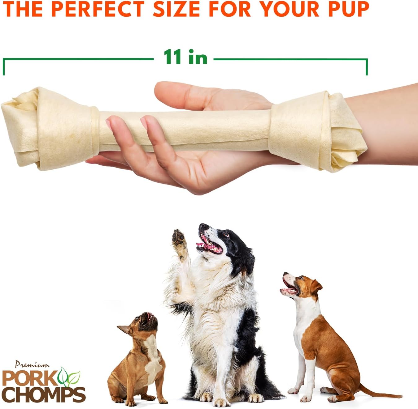 Premium Pork Chomps 11" Baked Knots Are Fully Digestible And The Perfect Rawhide Alternative For Your Pup!! Pork Chomps Are Made From Baked Pork Skin Creating A Healthy, Low Fat, High Protein Dog Chew. This Wholesome Chew Is Made With Limited Ingredients, Free Of Artificial Flavors, Dyes And Preservatives, And Preferred By Dogs Everywhere! Premium Pork Chomps Are The Long Lasting Rawhide Alternative That Will Keep You Pup Constructively Chewing For Hours! In 2012, The University Of Illinois College Of Veterinary Science Conducted A Study Which Proved Pork Skin To Be 99.9% Digestible And Significantly More Digestible Than Beef Rawhide. Offering A Variety Of Sizes, Shapes And Flavors, Premium Pork Chomps Is The Chew Dogs Crave And Pet Parents Can Feel Good About Too! Safe And Healthy Premium Pork Chomps 11-12" Baked Knots Are The Right Size For Large And Extra Large Dogs. 4 Count Resealable Package