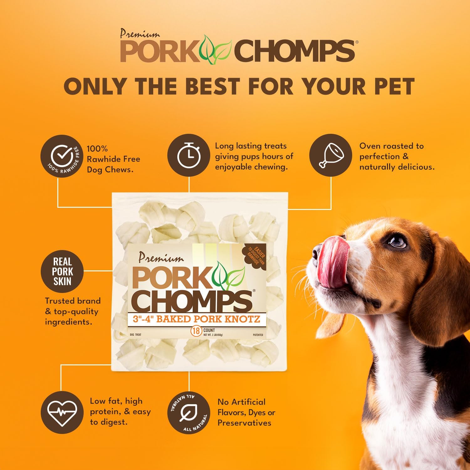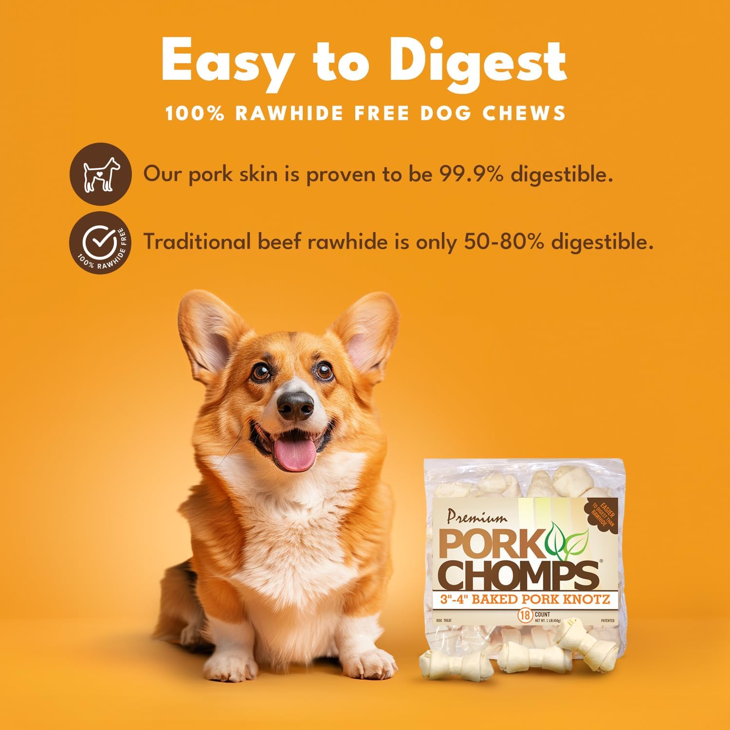 Premium Pork Chomps 3” Baked Knots Are Fully Digestible And The Perfect Rawhide Alternative For Your Pup!! Pork Chomps Are Made From Baked Pork Skin Creating A Healthy, Low Fat, High Protein Dog Chew. This Wholesome Chew Is Made With Limited Ingredients, Free Of Artificial Flavors, Dyes And Preservatives, And Preferred By Dogs Everywhere! Premium Pork Chomps Are The Long Lasting Rawhide Alternative That Will Keep You Pup Constructively Chewing For Hours! In 2012, The University Of Illinois College Of Veterinary Science Conducted A Study Which Proved Pork Skin To Be 99.9% Digestible And Significantly More Digestible Than Beef Rawhide. Offering A Variety Of Sizes, Shapes And Flavors, Premium Pork Chomps Is The Chew Dogs Crave And Pet Parents Can Feel Good About Too! Safe And Healthy Premium Pork Chomps 3” Baked Knots Are The Right Size For Miniature Dogs And Small Dogs. 18 Count Resealable Package