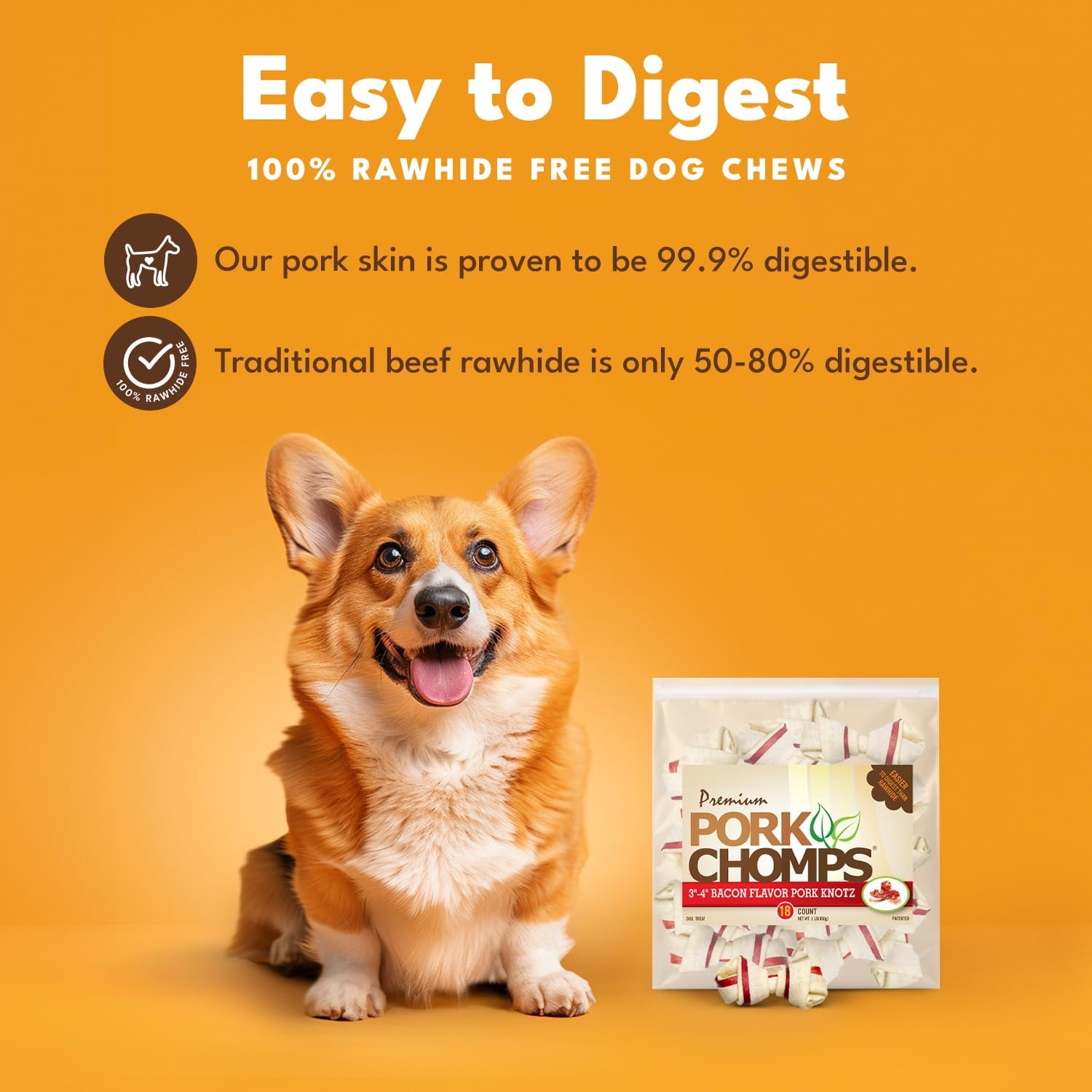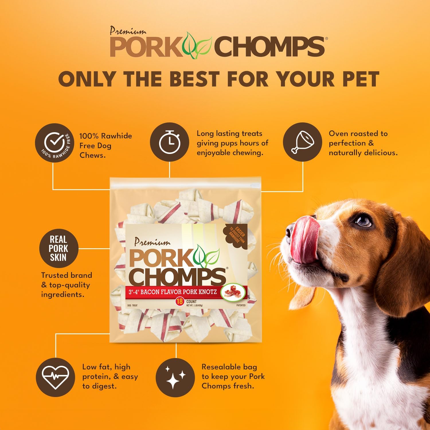 Pork Chomps Baked Pork Skin Dog Chews, 3-Inch Knots, With Bacon Flavor Strip, 18 Count