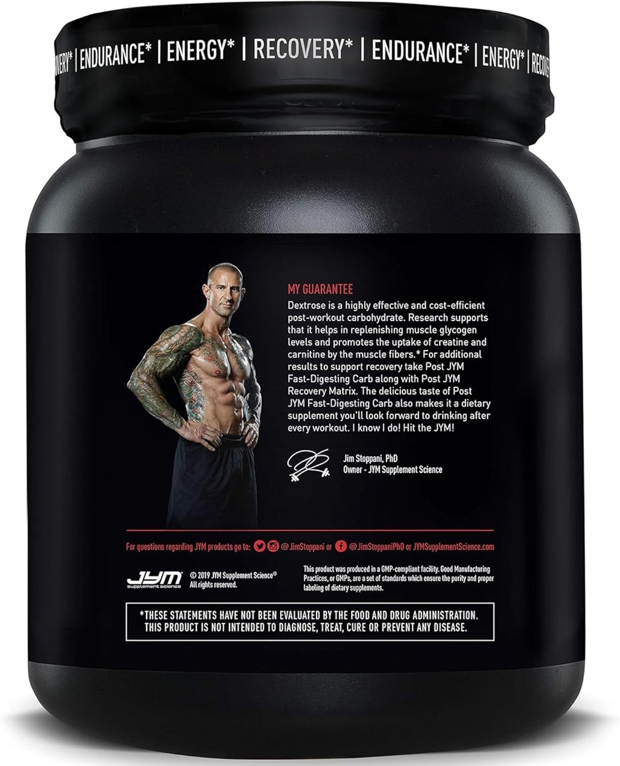 About this item More Muscle - Replenishing muscle glycogen stores as quickly and fully as possible after an intense workout is paramount to maximizing muscle recovery and thus muscle growth and strength. This is the sole purpose of Post JYM fast carbs. Great Taste - No other post-workout supplements surpass the delicious of taste Pro JYM. Post-workout is the one time when having a sugary drink will actually benefit your body and not be stored as body fat. Simply mix with water and enjoy. Faster Replenishment - Research shows that the best way to replenish muscle glycogen stores after workouts is to consume high-glycemic carbs immediately following the workout. Dextrose is the quickest absorbing carb you can find and the perfect choice post-workout. Ideal Levels - Post JYM Carb will help your body achieve elevated insulin levels. Having insulin in your bloodstream immediately after workouts helps glucose, amino acids (BCAA's), and creatine to be taken up by muscle cells to maximize their growth. Versatile Use - The Fast-Digesting Carb postworkout powder is offered separately from the Active Matrix so that you can control your carbs and customize your post workout nutrition plan. It works great for both men and for women in supporting BCAAs intake. See more product details,More Muscle - Replenishing muscle glycogen stores as quickly and fully as possible after an intense workout is paramount to maximizing muscle recovery and thus muscle growth and strength. This is the sole purpose of Post JYM fast carbs,Great Taste - No other post-workout supplements surpass the delicious of taste Pro JYM. Post-workout is the one time when having a sugary drink will actually benefit your body and not be stored as body fat. Simply mix with water and enjoy,Faster Replenishment - Research shows that the best way to replenish muscle glycogen stores after workouts is to consume high-glycemic carbs immediately following the workout. Dextrose is the quickest absorbing carb you can find and the perfect choice post-workout,Ideal Levels - Post JYM Carb will help your body achieve elevated insulin levels. Having insulin in your bloodstream immediately after workouts helps glucose, amino acids (BCAA's), and creatine to be taken up by muscle cells to maximize their growth,Versatile Use - The Fast-Digesting Carb postworkout powder is offered separately from the Active Matrix so that you can control your carbs and customize your post workout nutrition plan. It works great for both men and for women in supporting BCAAs intake