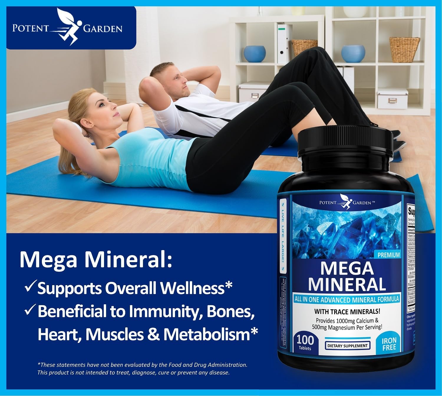 Potent Garden Mega Mineral Supplement Complete Mineral Complex With Calcium Magnesium Zinc Potassium Boron Selenium Chromium & 72 Trace Minerals Iron Free Calcium Supplement -100 Pills