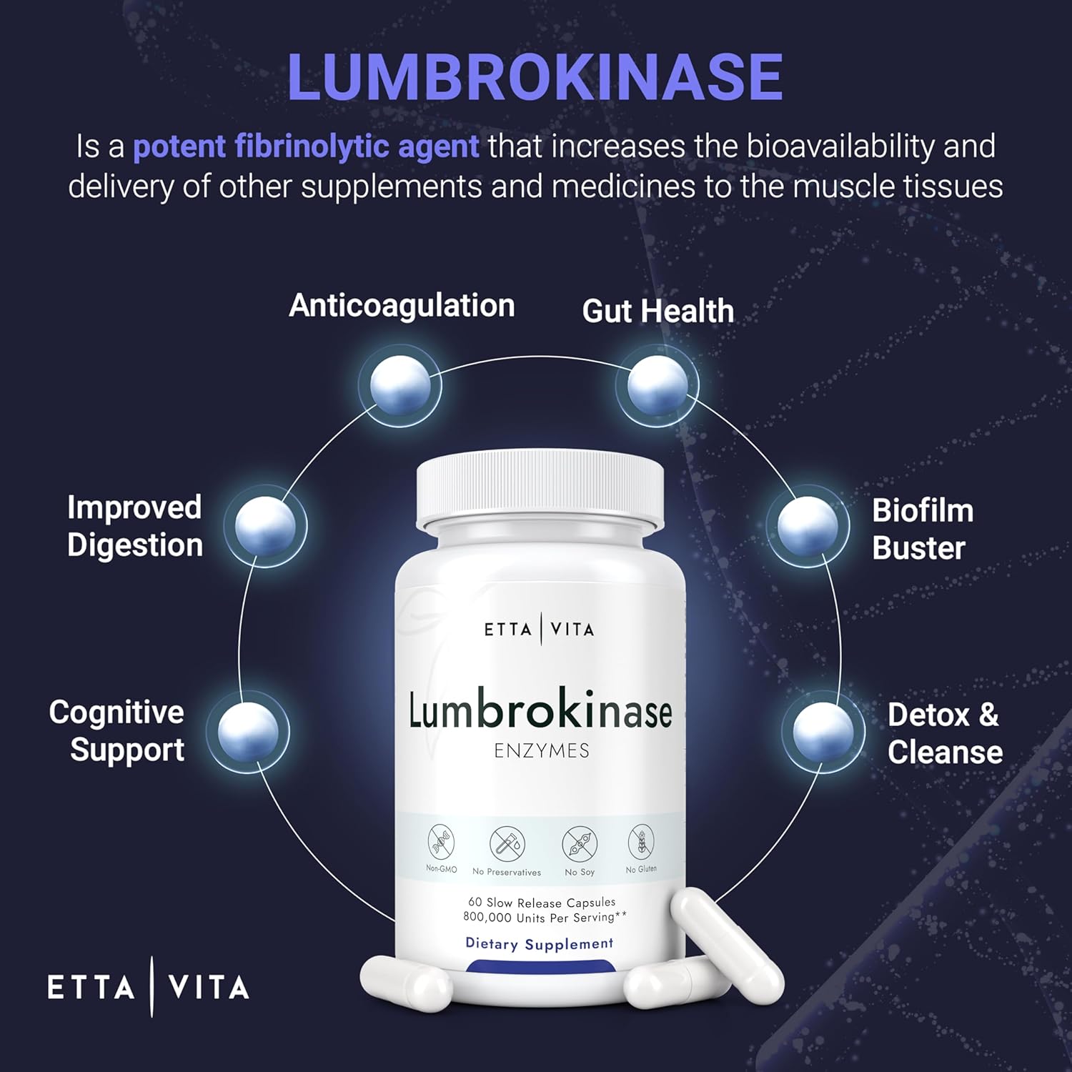 About this item [Proteolytic Enzymes] Other names for lumbrokinase include earthworm powder enzymes (EPE) or earthworm fibrinolytic enzymes (e-PPA). Lumbrokinase is stronger than Nattokinase. Etta Vita's Lumbrokinase enzyme supplement delivers digestive enzymes to the gut and digestive tract. It also increases the bioavailability and delivery of other supplements and medicines to the muscle tissues. [Powerful Formula] Each 40mg serving contains 800,000 LKU (lumbrokinase units) per capsule, ensuring optimal fibrinolytic activity. This enzyme blend is fortified with Magnesium, Stearate, and MCT powder, making it nearly 100 times more potent than serrapeptase and nattokinase supplements. [Ischemic Health] Lumbrokinase is a potent fibrinolytic agent that can also indirectly prevent clotting by impeding platelet activity because it contains an enzyme that works against the coagulation system; hence, it supports blood flow by lowering blood viscosity. [Biofilm Disruptor] Biofilms are layers of slime that can clot and hide bad bacteria while remaining undetected. Lumbricus rubellus earthworm or Lumbrokinase is a safe and natural blood thinner and can help break down these clumps to increase blood flow while reducing concerning clots. [Proud Donors in The Community] Etta vita has been seen on ABC, CBS, NBC, USA Today, and Digital Journal and believes in giving back to the community every year; for this, we have partnered with Feed The Hungry, Vitamin Angels, House of Hope, 4 The Community, and many others to fight against malnutrition globally. See more product details,[Proteolytic Enzymes] Other names for lumbrokinase include earthworm powder enzymes (EPE) or earthworm fibrinolytic enzymes (e-PPA). Lumbrokinase is stronger than Nattokinase. Etta Vita's Lumbrokinase enzyme supplement delivers digestive enzymes to the gut and digestive tract. It also increases the bioavailability and delivery of other supplements and medicines to the muscle tissues,[Powerful Formula] Each 40mg serving contains 800,000 LKU (lumbrokinase units) per capsule, ensuring optimal fibrinolytic activity. This enzyme blend is fortified with Magnesium, Stearate, and MCT powder, making it nearly 100 times more potent than serrapeptase and nattokinase supplements,[Ischemic Health] Lumbrokinase is a potent fibrinolytic agent that can also indirectly prevent clotting by impeding platelet activity because it contains an enzyme that works against the coagulation system; hence, it supports blood flow by lowering blood viscosity,[Biofilm Disruptor] Biofilms are layers of slime that can clot and hide bad bacteria while remaining undetected. Lumbricus rubellus earthworm or Lumbrokinase is a safe and natural blood thinner and can help break down these clumps to increase blood flow while reducing concerning clots,[Proud Donors in The Community] Etta vita has been seen on ABC, CBS, NBC, USA Today, and Digital Journal and believes in giving back to the community every year; for this, we have partnered with Feed The Hungry, Vitamin Angels, House of Hope, 4 The Community, and many others to fight against malnutrition globally