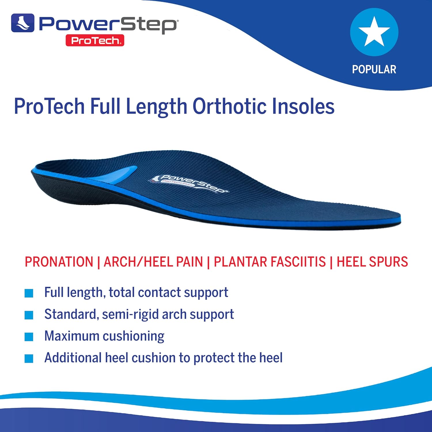 that features a heel pad that further cushions and protects during heel strike and an odor control top fabric that helps reduce heat, friction, and perspiration Full length, total contact support with a deep heel cradle for increased comfort, stability, and motion control for those with standard arches Firm but flexible contoured neutral arch support cushioning features Premium dual-layer support that provides bounce back with each step and enhanced comfort from heel to toe while absorbing shock at impact to reduce stress on the feet, ankles, joints and tendons ShockAbsorb Premium Foam that stabilizes and aligns the feet to help relieve and prevent pain from mild to moderate pronation Perfect balance of comfort and support Moveable from shoe to shoe with no trimming required DESCRIPTION The PowerStep ProTech line of orthotics were developed by a podiatrist to provide a unique foot support system that goes beyond just comfort. The PowerStep ProTech full length orthotic insoles are a medical-grade foot support with built-in neutral arch and dual-layer cushioning that are the perfect balance of comfort and support. The ProTech insoles feature the signature PowerStep arch shape that cradles the arch and heel, adding stability and motion control to limit excess stress on feet, ankles, joints, and tendons. BENEFITS The ProTech insoles feature a ShockAbsorb Premium Foam cushion pad that cushions and protects at the heel, and an odor control top fabric that helps control heat, friction, and perspiration. The cushioning layer is made up of energy activating ShockAbsorb Premium Foam. Below the premium foam cushion layer is a semi-rigid neutral arch support and heel cradle for improved motion control. The lower layer is an EVA foam cushioning cover for maximum comfort. Feet with neutral arches naturally pronate when walking, where the feet and ankles roll slightly inward, placing pressure on the bigger toes and inside of the foot. Neutral arches need stable, yet flexible arch support for shock absorption and proper alignment. By combining premium cushioning and the clinically proven PowerStep arch shape in a semi-rigid neutral arch support shell, the PowerStep ProTech shoe insoles are a trusted solution to improve foot function, decrease arch pain, and help alleviate common foot conditions typically caused by mild to moderate pronation. Mild to moderate pronation can cause:Plantar Fasciitis; Achilles Tendonitis; Arch & heel pain; Ankle, knee, hip & back pain; Shin splints; Bunions; Heel spurs; Hammer & claw toes; Calluses & corns SPECIFICATIONS Heel Pad: ShockAbsorb Premium Foamheel pad, royal blue Top Cover:Odor control polyester top fabric, navy blue Arch:Semi-rigid polypropylene support shell Dual Layer Cushioning:ShockAbsorb Premium Foam top layer, royal blue; EVA base, black Shoe Sizes: Available in 11 sizes ranging from Men's U.S. shoe sizes 4 to 16+, and Women's U.S. shoe sizes 6 to 12 Packaging Contains:1 pair Ideal shoe type:Intended for footwear where the factory insoles can be removed and designed for shoes such as Athletic (Walking/Running), Work, & Casual Dress Shoes Proper care: Spot clean with mild detergent. Do not immerse in water. Air dry. Covered under US Patent #D846,853 PowerStep insoles should last 6 months or longer depending on wear usage and activity level. Need more information Visit our FAQs