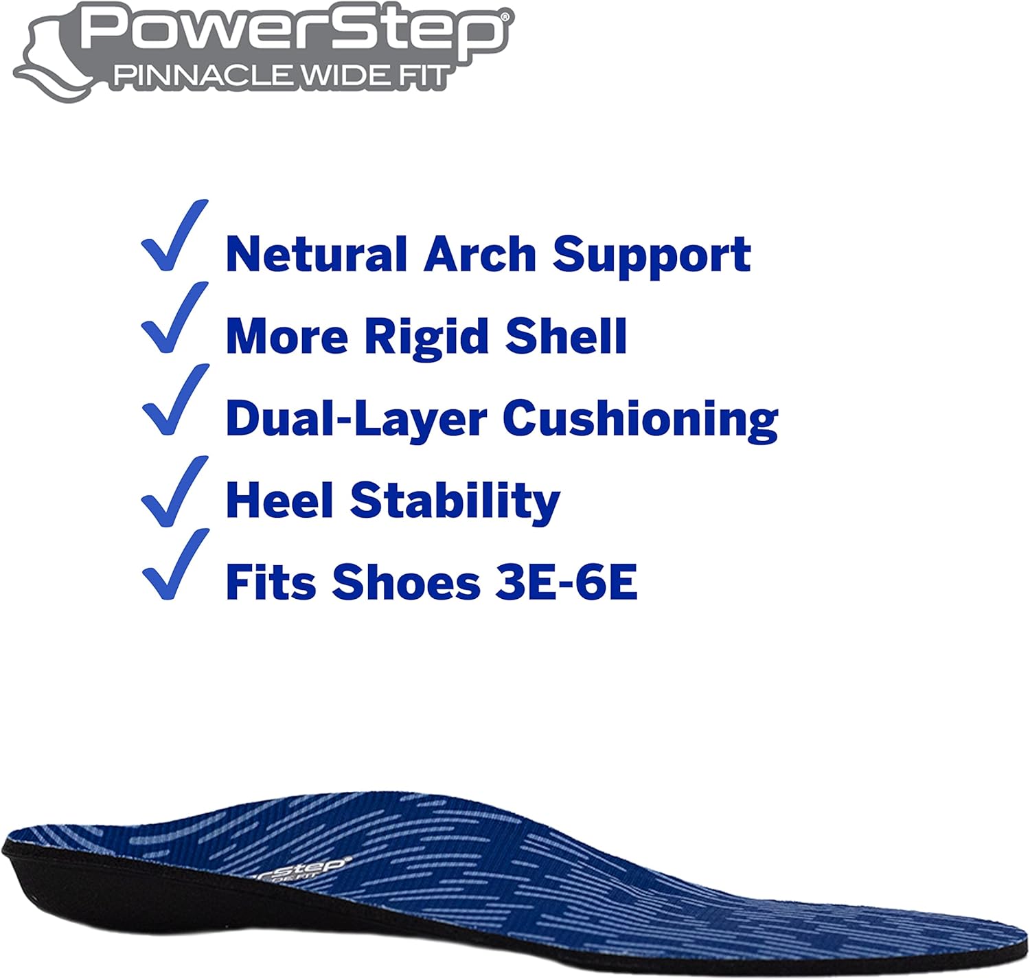 WIDE, EXTRA WIDE DESIGN: The PowerStep Pinnacle Wide insole are designed for shoe width 3E-6E and include dual-layer cushioning for enhanced comfort from heel to toe