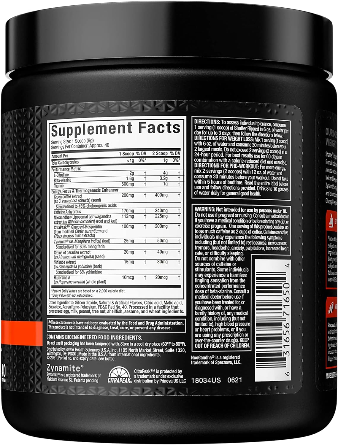 BULLET POINTS : 1 > PRE WORKOUT POWDER - Shatter Ripped is the ultimate 2-in-1 hybrid formula designed with the most sought-after pre-workout ingredients, plus C. canephora robusta extract, a scientifically tested weight loss ingredient, to look and feel your best