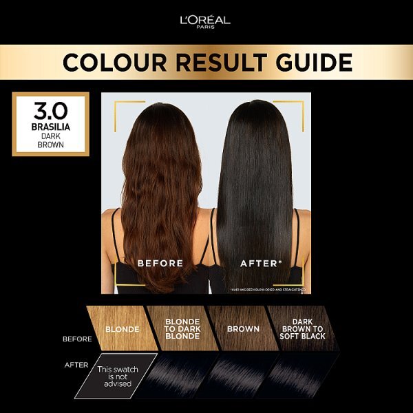 Product Information:Shade 3.0 Brasilia Shade 3.0 was inspired by Brasilia. This dark brown is as astonishing as the city's futuristic architecture and is perfect for a natural look on every skin tone. Luminous Colour Full of Reflects The translucent gel formula associated with the new precious oil drop intensifies natural tones of your hair colour. Up to 100% grey coverage. Discover the unique shades of Preference with light-reflecting dyes, for a luminous colour full of reflects. New Sensorial Fragrance A new floral fragrance with amber notes for an improved sensorial experience at application. Shine Protect Conditioner Enriched with a UV filter and Vitamin E derivative. Use week after week to preserve the shine of your coloured hair,Features:Up to 8 weeks of fade-defying colour Lustrous day-1 colour and shine Ultra-intense,Warning or Restrictions:We advise, and it is stated on the product instructions, everyone should perform a strand test before dyeing their hair, even if they have used the product before, as that ensures they will achieve the right result,Product Specification:1055751 - Colourant Gel: Aqua / Water, Trideceth-2 Carboxamide MEA, Propylene Glycol, Hexylene Glycol, PEG-2 Oleamine, Polyglyceryl-4 Oleyl Ether, Oleyl Alcohol, Alcohol Denat., Ammonium Hydroxide, Polyglyceryl-2 Oleyl Ether, Oleic Acid, Sodium Diethylaminopropyl Cocoaspartamide, p-Phenylenediamine, 2,4-Diaminophenoxyethanol HCL, M-Aminophenol, Hydroxypropyl BIS(N-Hydroxyethyl-P-Phenylenediamine) HCL, Hydroxybenzomorpholine, Eugenol, Ammonium Acetate, Ammonium Thiolactate, Pentasodium Pentetate, N,N-BIS(2-Hydroxyethyl)-p-Phenylenediamine Sulfate, Linalool, Alpha-Isomethyl Ionone, Resorcinol, Citronellol, Erythorbic Acid, Parfum / Fragrance, F.I.L. C32814/1,178914 - Developer Creme: Aqua / Water, Hydrogen Peroxide, Cetearyl Alcohol, Sodium Stannate, Trideceth-2 Carboxamide MEA, Pentasodium Pentetate, Phosphoric Acid, Ceteareth-25, Tetrasodium Pyrophosphate, Glycerin, F.I.L. C13169/25,1087166 E - High Shine Conditioner: Aqua / Water, Cetearyl Alcohol, Glycerin, Behentrimonium Chloride, Candelilla Cera / Candelilla Wax, Amodimethicone, Cetyl Esters, Isopropyl Alcohol, Tocopheryl Acetate, Alcohol Denat., Lecithin, Tocopherol, Sodium PCA, Oleth-10, PPG-5-Ceteth-20, Ethylhexyl Methoxycinnamate, Ethylhexyl Salicylate, Trideceth-6, Chlorhexidine Dihydrochloride, Limonene, Camelina Sativa Oil / Camelina Sativa Seed Oil, Linalool, Benzyl Alcohol, Benzyl Benzoate, Phosphoric Acid, Geraniol, Disodium Cocoamphodipropionate, Cetrimonium Chloride, Butylphenyl Methylpropional, Citronellol, Hexyl Cinnamal, Amyl Cinnamal, Parfum / Fragrance, F.I.L. C159572/2,1166543 - Colour Extender: Aqua / Water, Cetearyl Alcohol, Behentrimonium Chloride, Amodimethicone, HC Blue No. 2, CI 60730 / Ext. Violet 2, C12-15 Alkyl Benzoate, Guar Hydroxypropyltrimonium Chloride, Hydroxyethylcellulose, Hydroxyanthraquinoneaminopropyl Methyl Morpholinium, Methosulfate, Sodium Hydroxide, Stearyl Alcohol, Trideceth-6, Chlorhexidine Digluconate, Limonene, Fumaric Acid, Linalool, Benzyl Alcohol, Benzyl Benzoate, Isopropyl Alcohol, Myristyl Alcohol, Geraniol, Basic Brown 17, Basic Yellow 87, Cetyl Alcohol, Citric Acid, Butylphenyl Methylpropional, Cetrimonium Chloride, Hexyl Cinnamal, Amyl Cinnamal, Parfum / Fragrance, F.I.L. C178465/1,Please check back of pack for up to date ingredients,Product Uses:STEP 1 β BEFORE COLOURING: Remember to be colour safe and always do your patch test 48 hours before use, even if you have already used colouring products before. Please follow the instruction leaflet and read the safety information. STEP 2 β PREP: Cover your shoulders with a towel and put on the gloves. Open the colouring bottle and pour it entirely into the developer bottle. Close with the applicator tip and shake it to obtain a completely even mixture. Twist off the applicator tip immediately to avoid bursting and damage from the product over flowing. STEP 3 β APPLY COLOUR: Part your hair into small, even sections and apply the colour. Refer to instructions for development time. Apply conditioner and then rinse thoroughly