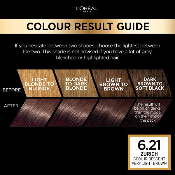 Product Information:Shade 6.21 Zurich Shade 6.21 was inspired by Zurich, the cultural emblem of Switzerland. This elegant light brown, enriched with cool iridescent reflects, is as refined as the Swiss finest jewellery. Luminous Colour Full Of Reflects The translucent gel formula associated with the new precious oil drop intensifies natural tones of your hair colour. Discover the unique shades of Preference with light-reflecting dyes, for a luminous colour full of reflects. New Sensorial Fragrance A new floral fragrance with amber notes for an improved sensorial experience at application. Shine Protect Conditioner Enriched with a UV filter and Vitamin E derivative. Use week after week to preserve the shine of your coloured hair,Features:Up to 8 weeks of fade-defying colour Lustrous day-1 colour and shine Ultra-intense,Warning or Restrictions:We advise, and it is stated on the product instructions, everyone should perform a strand test before dyeing their hair, even if they have used the product before, as that ensures they will achieve the right result,Product Specification:1175239 - Colourant Gel: Aqua / Water, Trideceth-2 Carboxamide MEA, Propylene Glycol, Hexylene Glycol, PEG-2 Oleamine, Polyglyceryl-4 Oleyl Ether, Oleyl Alcohol, Alcohol Denat., Ammonium Hydroxide, Polyglyceryl-2 Oleyl Ether, Oleic Acid, Sodium Diethylaminopropyl Cocoaspartamide, 2,4-Diaminophenoxyethanol HCL, M-Aminophenol, Sodium Metabisulfite, Eugenol, Thioglycerin, Toluene-2,5-Diamine, Ammonium Acetate, Pentasodium Pentetate, N,N-BIS(2-Hydroxyethyl)-p-Phenylenediamine Sulfate, Linalool, Alpha-Isomethyl Ionone, Resorcinol, Citronellol, Erythorbic Acid, Parfum / Fragrance, F.I.L C171964/1,178914 - Developer Creme: Aqua / Water, Hydrogen Peroxide, Cetearyl Alcohol, Sodium Stannate, Trideceth-2 Carboxamide MEA, Pentasodium Pentetate, Phosphoric Acid, Ceteareth-25, Tetrasodium Pyrophosphate, Glycerin , F.I.L. C13169/25,1087166 E - High Shine Conditioner: Aqua / Water, Cetearyl Alcohol, Glycerin, Behentrimonium Chloride, Candelilla Cera / Candelilla Wax, Amodimethicone, Cetyl Esters, Isopropyl Alcohol, Tocopheryl Acetate, Alcohol Denat., Lecithin, Tocopherol, Sodium PCA, Oleth-10, PPG-5-Ceteth-20, Ethylhexyl Methoxycinnamate, Ethylhexyl Salicylate, Trideceth-6, Chlorhexidine Dihydrochloride, Limonene, Camelina Sativa Oil / Camelina Sativa Seed Oil, Linalool, Benzyl Alcohol, Benzyl Benzoate, Phosphoric Acid, Geraniol, Disodium Cocoamphodipropionate, Cetrimonium Chloride, Butylphenyl Methylpropional, Citronellol, Hexyl Cinnamal, Amyl Cinnamal, Parfum / Fragrance, F.I.L. C159572/2,1166538 - Colour Extender: Aqua / Water, Cetearyl Alcohol, Behentrimonium Chloride, Amodimethicone, C12-15 Alkyl Benzoate, Guar Hydroxypropyltrimonium Chloride, Hydroxyethylcellulose, Hydroxyanthraquinoneaminopropyl Methyl Morpholinium, Methosulfate, Sodium Hydroxide, Stearyl Alcohol, Trideceth-6, Chlorhexidine Digluconate, Limonene, Fumaric Acid, Linalool, Benzyl Alcohol, Benzyl Benzoate, Isopropyl Alcohol, Myristyl Alcohol, Geraniol, Cetyl Alcohol, Citric Acid, Butylphenyl Methylpropional, Cetrimonium Chloride, Hexyl Cinnamal, Amyl Cinnamal, Parfum / Fragrance, F.I.L C178462/1,Product Uses:STEP 1 β BEFORE COLOURING: Remember to be colour safe and always do your patch test 48 hours before use, even if you have already used colouring products before. Please follow the instruction leaflet and read the safety information. STEP 2 β PREP: Cover your shoulders with a towel and put on the gloves. Open the colouring bottle and pour it entirely into the developer bottle. Close with the applicator tip and shake it to obtain a completely even mixture. Twist off the applicator tip immediately to avoid bursting and damage from the product over flowing. STEP 3 β APPLY COLOUR: Part your hair into small, even sections and apply the colour. Refer to instructions for development time. Apply conditioner and then rinse thoroughly