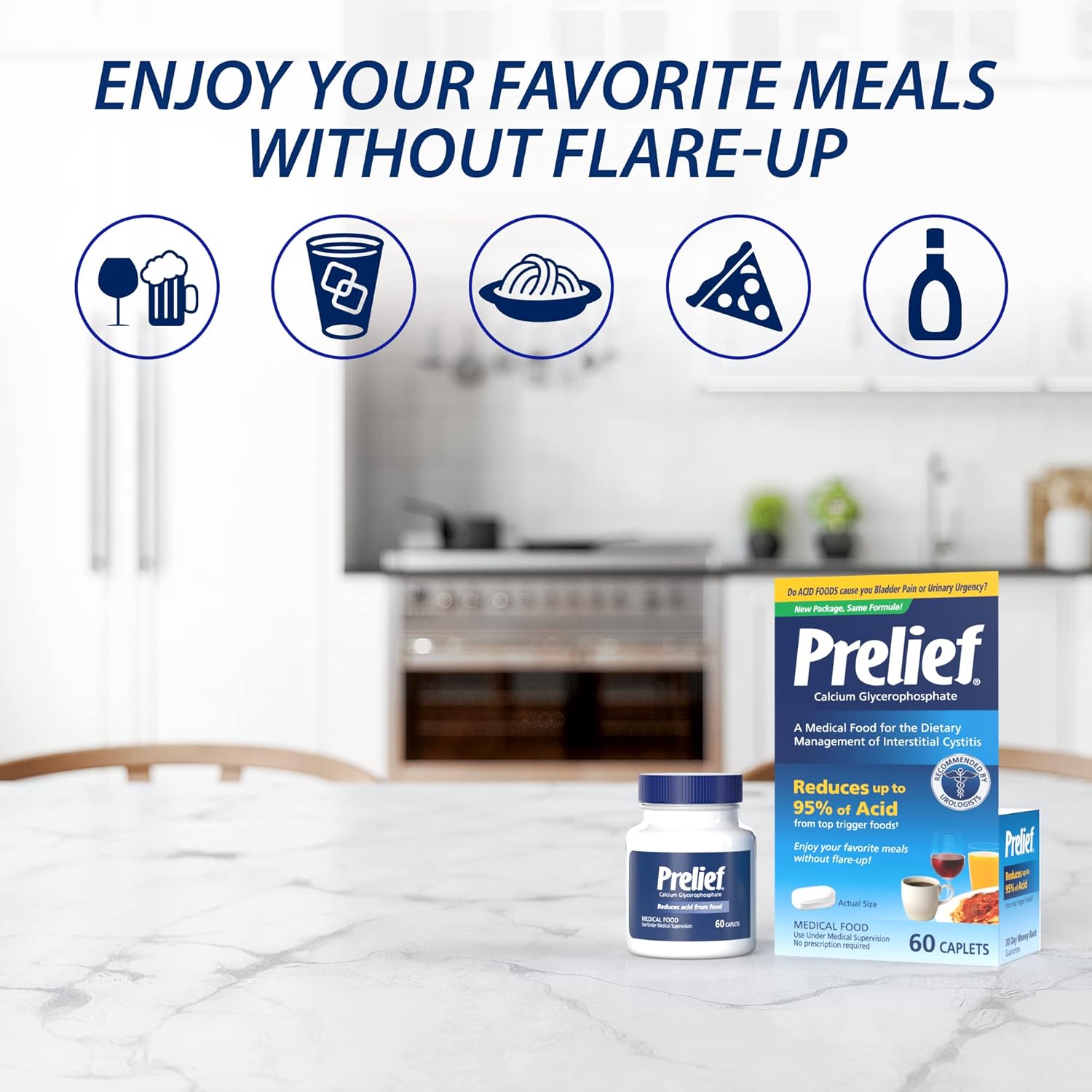 Contains (1) bottle of (60) caplets Prelief Acid Reducer, dietary supplement. Prelief works on high acidity foods or drinks to reduce the acidity up to 95%, decreasing digestive discomfort and bladder discomfort caused by overly acidic food and drinks,Reduce Acid: Prelief safely and effectively reduces the acid from foods and beverages,Dine Worry Free: Prelief can reduce acid by up to 95 percent from "trigger foodsâ that can cause discomfort like coffee, wine, tomato sauce, fruits and juices,Drug Free: A good source of calcium, Prelief can be taken as often as you think you will need it; Taking 2 to 3 Prelief caplets with your food or drink can reduce the acid and minimize discomfort,Prelief is the number 1 recommended brand by Urologists and Urogynecologists for the dietary management of Interstitial Cystitis,Introduced in 1996 by developers of Lactaid and Beano, Prelief is the original product developed specifically to reduce acid from foods and drinks