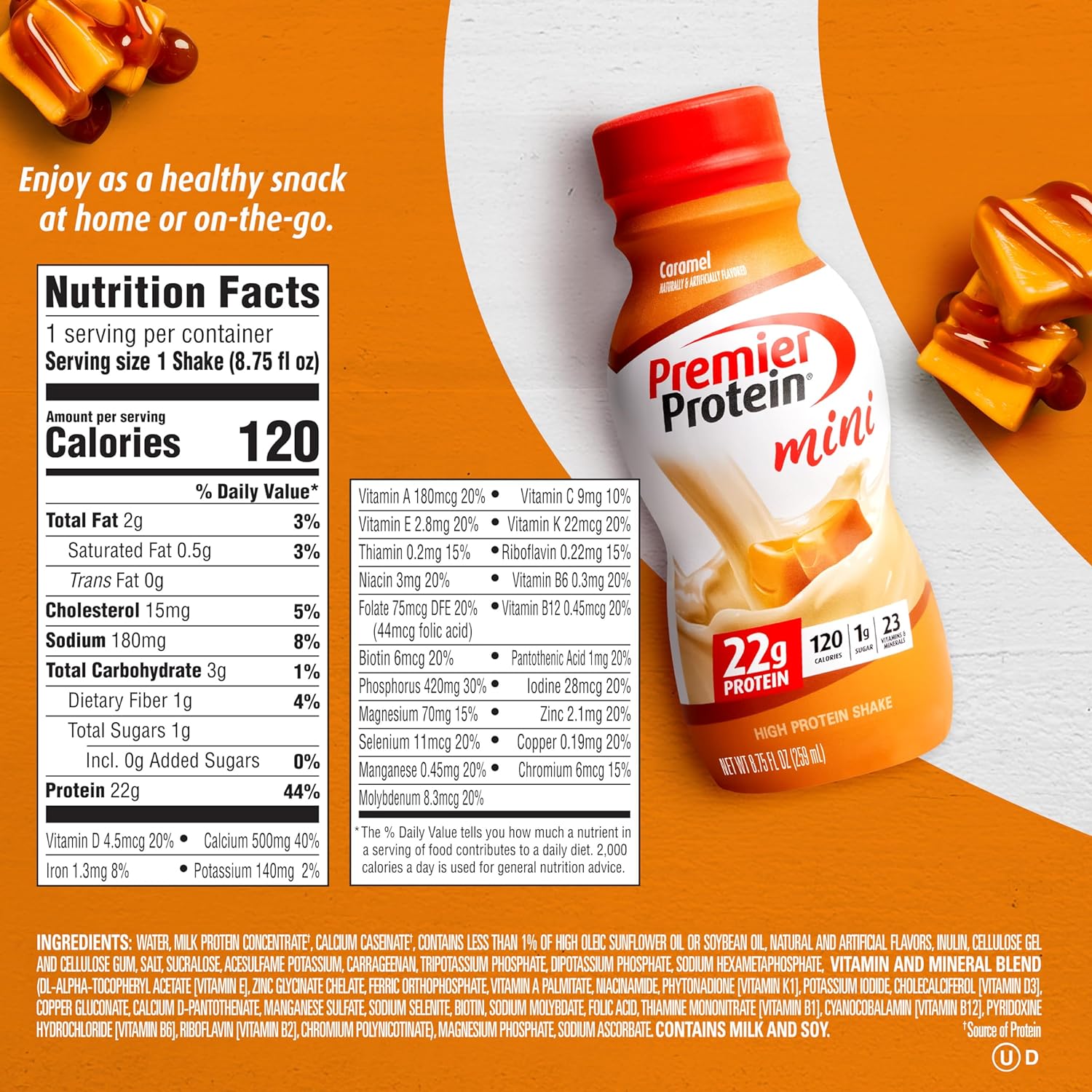 Premier Protein Shake Minis, Caramel, 22G Protein, 120 Calories, 1G Sugar, 8.75Fl Oz, Pack Of 12