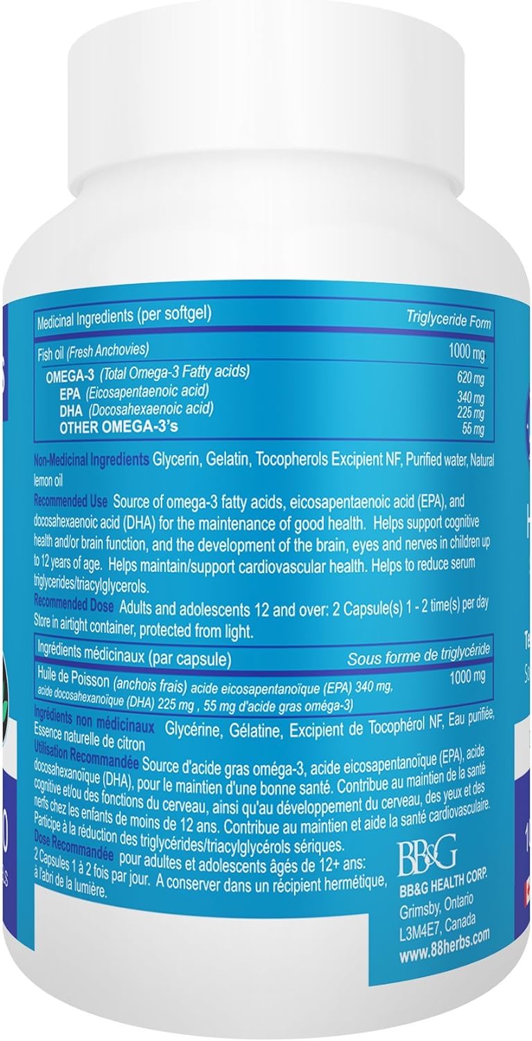 Non GMO Premium quality fish oil exclusively from Iceland - From fresh anchovy. Natural lemon flavor. No fish burbs. No aftertaste. Smells like fresh lemon pie10Each capsule contains: High Omega 3 (620 mg) High DHA (225 mg) High EPA (340 mg)10Triglyceride form. Superior natural triglyceride form (TG)10Lowest Heavy Metal Content – (Low mercury, lead, cadmium, etc) 3rd party lab tested. From trusted Canadian brand10Support cognitive function and brain health. Help reduce triglycerides in blood (serum triglycerides). Support cardiovascular health. Help with inflammation and improve overall health1010