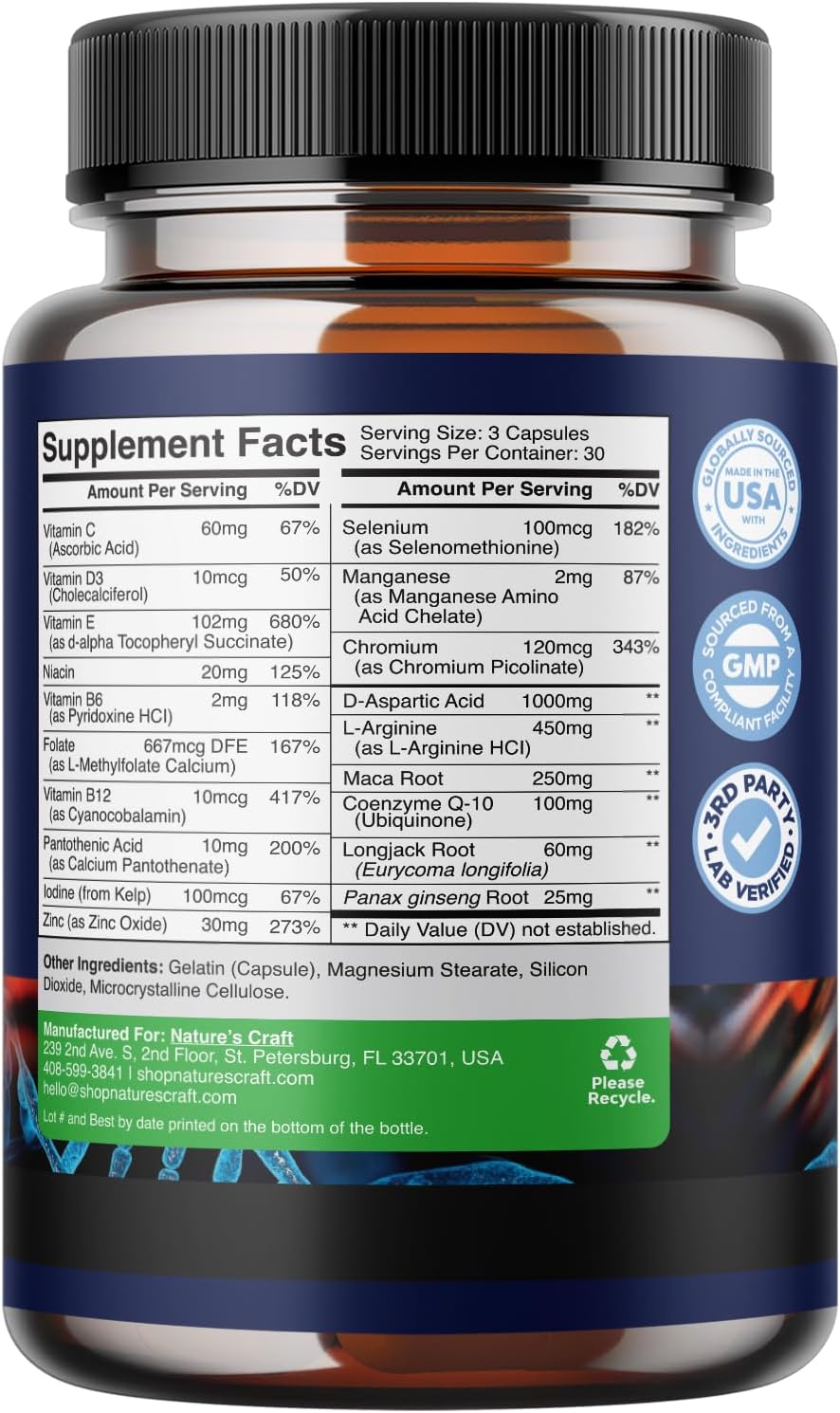 Conception pills - Many men fertility supplements contain only a few fertility vitamins but our proprietary prenatal for men is loaded with male vitamins minerals and herbs for improved potencyFertility blend for men - Our fertility supplements for men are packed with mens prenatal vitamins including d aspartic acid zinc for men folic acid 400mcg per serving tongkat ali for men CoQ10 selenium and moreMens health vitamin - Try our male reproductive health pills and see what our blend of support vitamins for men can do as a natural energy supplement to promote motility, drive, stamina, and volumeNatures Craft quality - We’re proud to be a leading name in herbal supplements and mens vitamins thanks to rigorous research and testing that goes into all of our natural supplements for men and womenPremium blend - Give your body the the support it needs with the help of our mens multivitamin maca root capsules for men featuring l arginine folate zinc manganese chromium panax ginseng and more