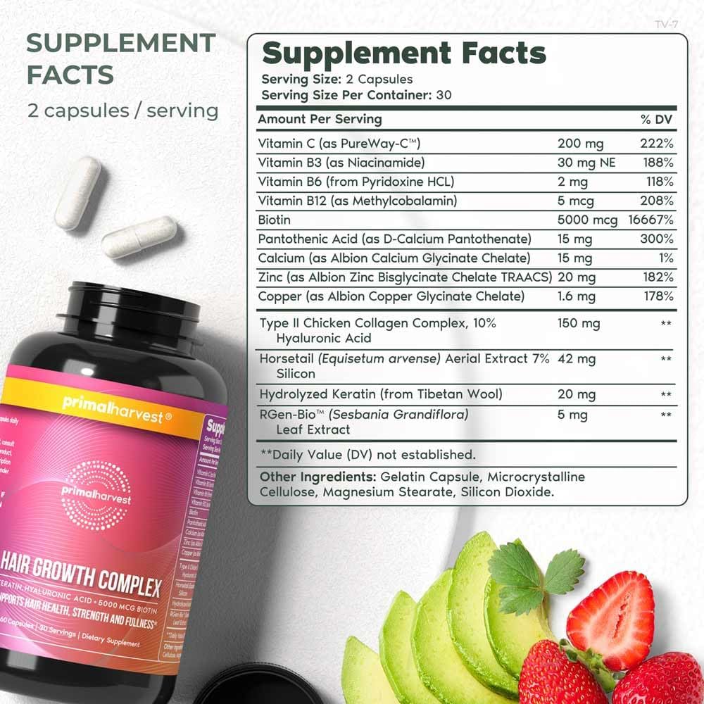 Primal Harvest 1 Pack, Hair Growth Vitamins, Hair Growth For Women & Men - 60 Hair Growth Pills, Natural Hair Thickening Product W/Biotin & Zinc - Hair Supplement, Regrowth Hair Vitamins