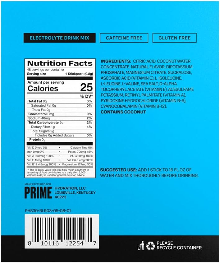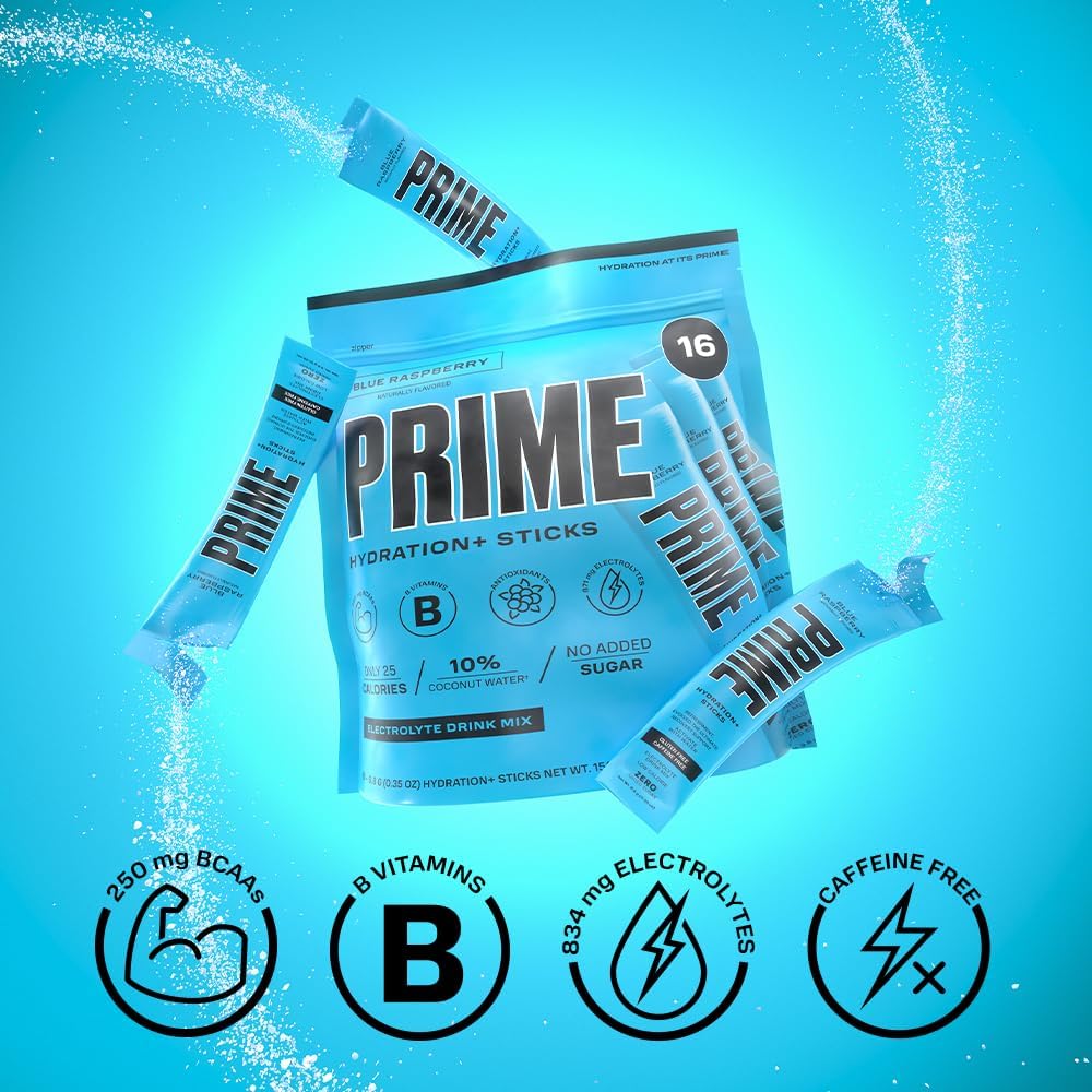 DESCRIPTION : PRIME Hydration+ Sticks BLUE RASPBERRY | Hydration Powder Single Serve Sticks | Electrolyte Powder On the Go | 250mg BCAAs, B Vitamins, Antioxidants | Low Sugar | Caffeine-Free | Vegan | 16 Pack16 Count (Pack of 1)