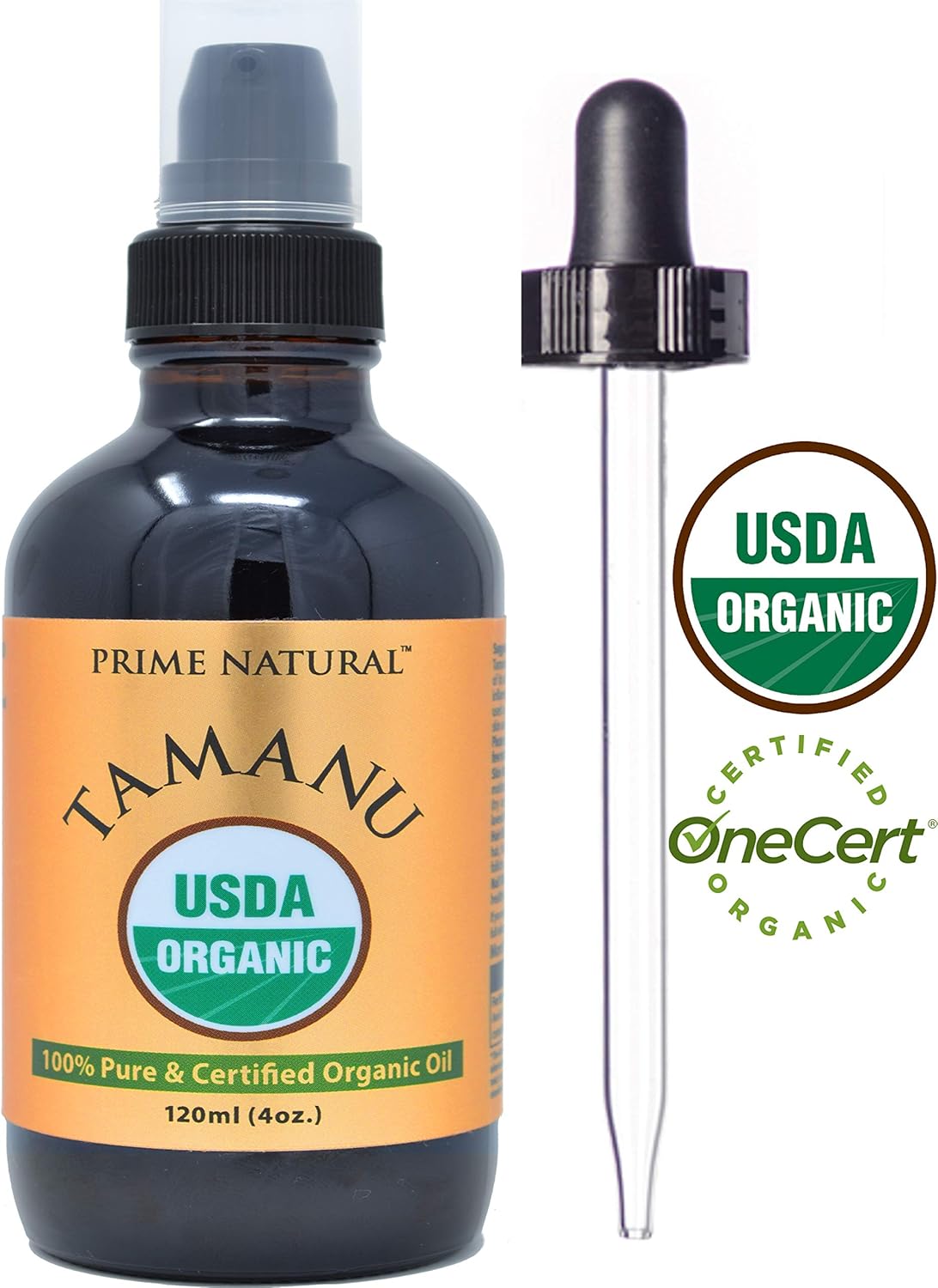 About this item USDA CERTIFIED ORGANIC TAMANU SEED OIL: Organic Tamanu Oil is cold-pressed from the nut kernels of the Tamanu Tree and is known for its incredible beauty and skin benefits. Tamanu oil contains Calophyllicacid (a unique fatty acid), Lactone & Calophyllolide that help with skin issues, improve the elasticity of the skin & promote healthier skin naturally SKIN REJUVENATING PROPERTIES: Tamanu oil is a fast acting skin rejuvenating agent with its unique ability to penetrate all three layers of the skin which may help to accelerate healing. CLINICALLY TESTED FOR NON-IRRITATING TO SKIN BY AMA LABORATORIES INC, USA: You can apply Our Tamanu oil all over your skin with confidence,Tamanu oil works exotically on the skin and may help with signs of aging. With its moisturizing properties and ability to penetrate three distinct layers of skin SCALP MASSAGE & HAIR GROWTH: Apply a few drops of organic Tamanu oil directly to your scalp. Gently massage the oil into your scalp using your fingertips in circular motions. This helps to improve blood circulation, nourish the scalp, and stimulate hair follicles for healthier hair growth. VERSATILE BEAUTY ESSENTIAL: Suitable for all skin types, organic Tamanu oil can be used as a moisturizer, acne, scar healer, and hair conditioner, offering a natural solution for your beauty needs SIZE 120ML (4OZ) WITH PUMP & DROPPER: Packaged in a high-quality dark amber glass bottle with a pump, glass dropper, and tamper-proof seal cap. The dropper will allow controlled oil dispensing for easy oil dropping for measurement without spilling.  See more product details,USDA CERTIFIED ORGANIC TAMANU SEED OIL: Organic Tamanu Oil is cold-pressed from the nut kernels of the Tamanu Tree and is known for its incredible beauty and skin benefits. Tamanu oil contains Calophyllicacid (a unique fatty acid), Lactone & Calophyllolide that help with skin issues, improve the elasticity of the skin & promote healthier skin naturally,SKIN REJUVENATING PROPERTIES: Tamanu oil is a fast acting skin rejuvenating agent with its unique ability to penetrate all three layers of the skin which may help to accelerate healing,CLINICALLY TESTED FOR NON-IRRITATING TO SKIN BY AMA LABORATORIES INC, USA: You can apply Our Tamanu oil all over your skin with confidence,Tamanu oil works exotically on the skin and may help with signs of aging. With its moisturizing properties and ability to penetrate three distinct layers of skin,SCALP MASSAGE & HAIR GROWTH: Apply a few drops of organic Tamanu oil directly to your scalp. Gently massage the oil into your scalp using your fingertips in circular motions. This helps to improve blood circulation, nourish the scalp, and stimulate hair follicles for healthier hair growth,VERSATILE BEAUTY ESSENTIAL: Suitable for all skin types, organic Tamanu oil can be used as a moisturizer, acne, scar healer, and hair conditioner, offering a natural solution for your beauty needs,SIZE 120ML (4OZ) WITH PUMP & DROPPER: Packaged in a high-quality dark amber glass bottle with a pump, glass dropper, and tamper-proof seal cap. The dropper will allow controlled oil dispensing for easy oil dropping for measurement without spilling
