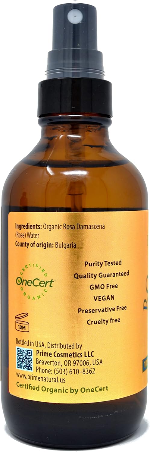 Prime Natural Rose Water Spray 4Oz/120Ml, Usda Certified Organic, Facial Toner, Hydrating Mist For Face & Hair - Bulgarian, 100% Pure, Natural, Preservative-Free, Moisturizer From Fresh Rose Petals