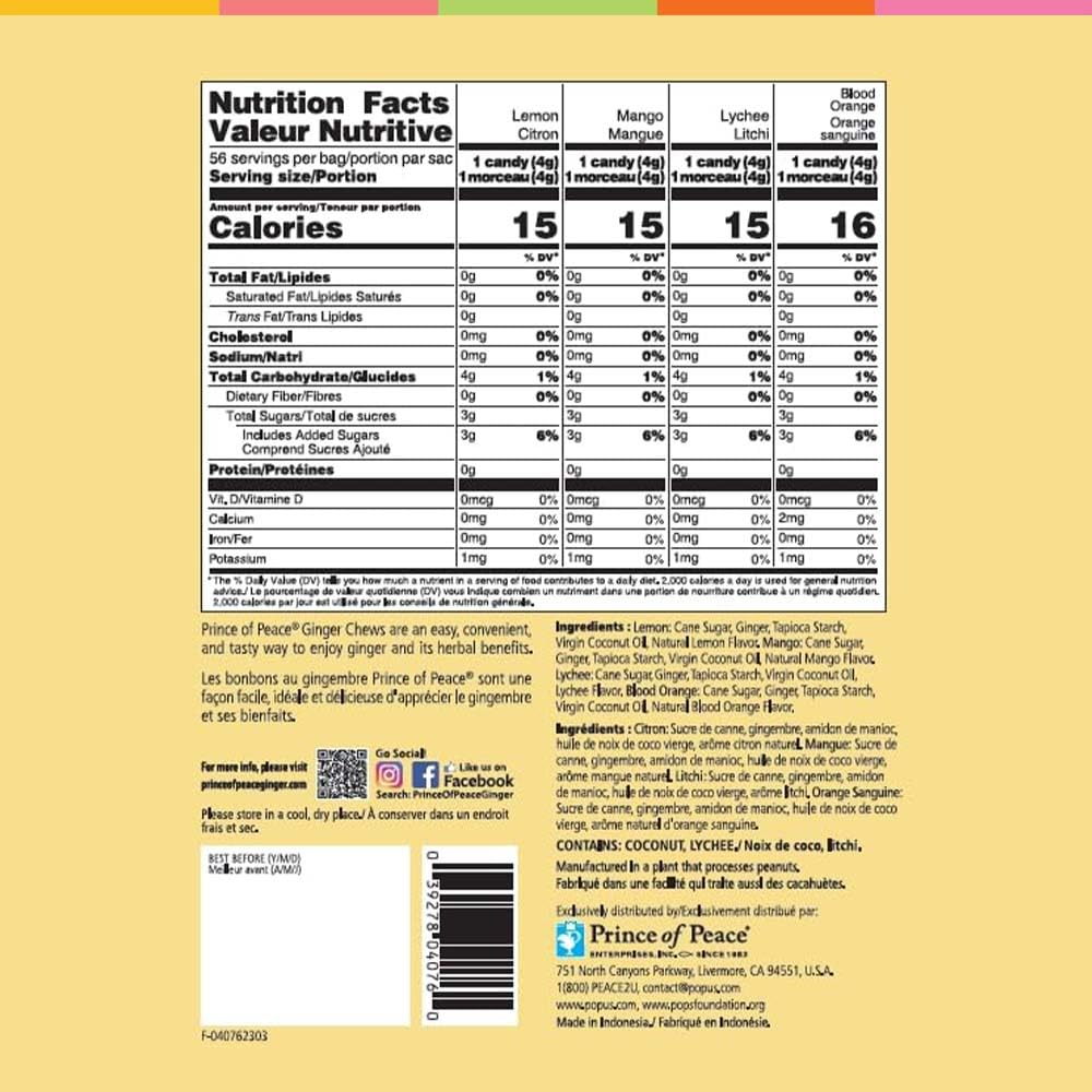 Fruity Flavor Variety Pack. Prince Of Peace Ginger Chews Are An Easy And Tasty Way For You To Enjoy Ginger Infused With A Variety Of Fruity Flavors On The Go, The Flavors Include Lemon, Lychee, Blood Orange, And Mango