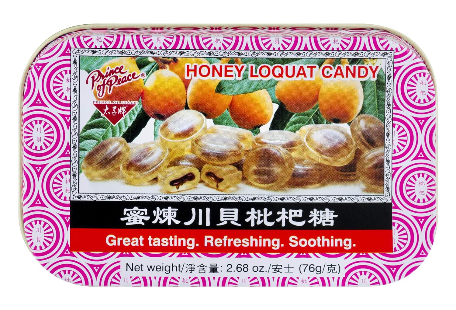 2.68 Ounces Each10Loquat is a yellow, pear-shaped, edible fruit of a small tree, Eriobotrya Japonica, native to Asia, now also commonly grown in California10This traditional Chinese soothing formula is reverently prepared in the form of a candy that has a hard minty shell and a soft syrup center of blended herbs10This Honey Loquat Candy tastes great and also works as a unique throat soother1010Han's honey loquat - prince of peace honey loquat candy - case of 8 - 76 grmcountry of origin : united statessize : 76 grmpack of : 8selling unit : caseingredients : glucose;sugar;loquat leaf;balloon flower root;fritillary;honey;mandarin peel;apricot kernel;licorice;menthol10