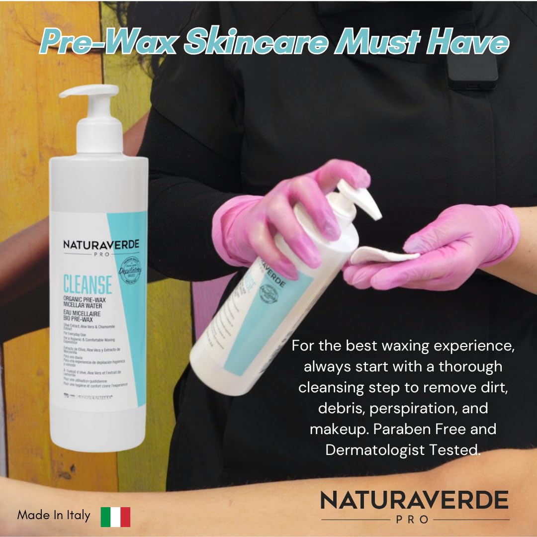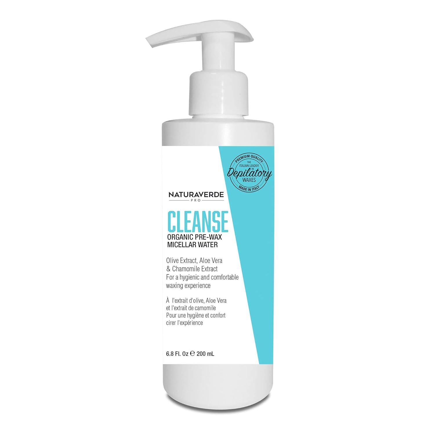 About this item Pre Wax Care: The Naturaverde Pro Cleanse Micellar Water effectively removes make up, oils, dirt, and perspiration. This helps to prepare the skin for a hygienic and comfortable waxing Organic Chamomile Oil: Helps to calm the skin and reduce irritation after wax Hydrating Aloe Vera and Organic Oats: Added aloe vera helps to keep skin hydrated during cleansing Nourishing Body and Face Cleanser: Perfect for all skin types. Can be used as a daily facial cleanser Esthetician Grade: Professional grade before and after wax care. Dermatologist Tested. Made in Italy › See more product details,Pre Wax Care: The Naturaverde Pro Cleanse Micellar Water effectively removes make up, oils, dirt, and perspiration. This helps to prepare the skin for a hygienic and comfortable waxing,Organic Chamomile Oil: Helps to calm the skin and reduce irritation after wax,Hydrating Aloe Vera and Organic Oats: Added aloe vera helps to keep skin hydrated during cleansing,Nourishing Body and Face Cleanser: Perfect for all skin types. Can be used as a daily facial cleanser,Esthetician Grade: Professional grade before and after wax care. Dermatologist Tested. Made in Italy