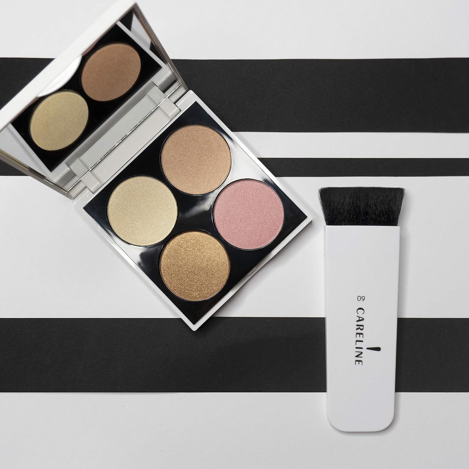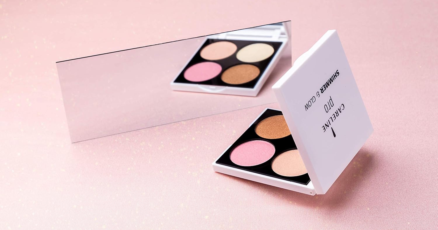 Careline shimmer & Glow kit professional Shimmer kit for lightening face and body skin. Combines 4 powerful, bright metallic blush tones that glow and create a 'sun Kiss' Feel and a radiant shine to every makeup style and skin tone. The glowing shimmer tones bring vitality to the face, upgrading every style of makeup and creating an illusion of radiant skin, like after a vacation where the sun kissed us lightly. The kit has 4 shades suitable for different areas of the face. You can combine or use Each one individually according to day or night and makeup style. All shades are also suitable for illuminating the face without full makeup, The shades in the kit: shimmer - Champagne light shade that shows reflection in translucent golden shade. Golden shimmer - a Sunbeam shimmer that creates a glittering reflection. Bronzer shimmer - a deep copper shade that creates a warm and radiant reflection. Sweet shimmer - a soft pink hue that creates a delicate pearl reflection,The professional technique to highlight features. Shimmer & Glow by Careline combines 4 bright and powerful metallic skin tones in a 4-shade kit, suitable for every part of the face,Give your complexion a beautiful glow with this highlighting duo. This powder formula blends seamlessly into the skin and stays put all day. For a glamorous look,A palette with 4 shades of highlighters to wear alone or layered on the face for a radiant glow. Can be used as day or night makeup,Ultra-fine shades that will not leave a shimmer finish. Apply them on the face and all over with a damp makeup brush for an added glow,Careline, caring about your beautiful since 1982