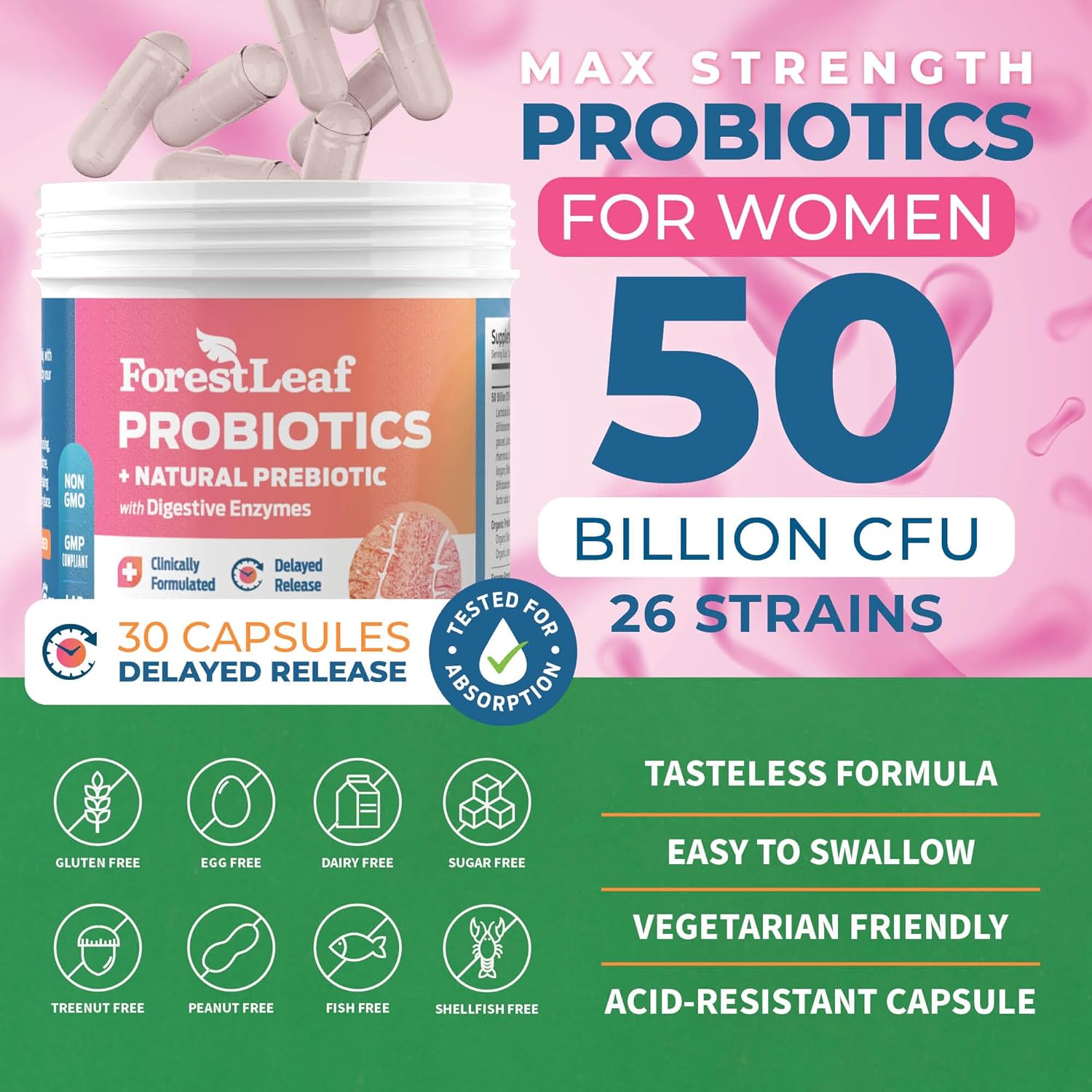 About this item 50 Billion CFU & Clinically Studied Strains – Our probiotics for women feature 50 billion CFU from 26 powerful strains, including Lactobacillus and Bifidobacterium, to support gut health, digestion, and immune function. These gut health probiotics women love are non-refrigerated and shelf-stable for convenience Organic Prebiotics & Delayed Release Formula – Our prebiotic and probiotics for women include organic prebiotics to nourish gut bacteria. The delayed-release capsules protect probiotics from stomach acid, ensuring they reach the intestines alive. These probiotics for women digestive health capsules promote better absorption and effectiveness Digestive & Gut Health Support – Designed for complete gut health, our digestive probiotics for women contain digestive enzymes that help break down food, reduce bloating, and improve nutrient absorption. This daily probiotic for women supports gut comfort while promoting overall digestive balance and wellness Women’s Health & Immune Support – Infused with D-Mannose, cranberry, and hibiscus, our probiotics for women immune support a balanced vaginal microbiome and urinary tract health. These strong probiotics for women also help maintain pH balance, offering a targeted formula for overall well-being Pure, Lab-Tested, & GMP Compliant – Our ForestLeaf vegan probiotics womens formula is made in a GMP-certified facility, ensuring the highest purity and quality. These probiotics and prebiotics for women digestive health are non-GMO, gluten-free, and third-party lab tested to ensure potency and safety for daily use See more product details,50 Billion CFU & Clinically Studied Strains – Our probiotics for women feature 50 billion CFU from 26 powerful strains, including Lactobacillus and Bifidobacterium, to support gut health, digestion, and immune function. These gut health probiotics women love are non-refrigerated and shelf-stable for convenience,Organic Prebiotics & Delayed Release Formula – Our prebiotic and probiotics for women include organic prebiotics to nourish gut bacteria. The delayed-release capsules protect probiotics from stomach acid, ensuring they reach the intestines alive. These probiotics for women digestive health capsules promote better absorption and effectiveness,Digestive & Gut Health Support – Designed for complete gut health, our digestive probiotics for women contain digestive enzymes that help break down food, reduce bloating, and improve nutrient absorption. This daily probiotic for women supports gut comfort while promoting overall digestive balance and wellness,Women’s Health & Immune Support – Infused with D-Mannose, cranberry, and hibiscus, our probiotics for women immune support a balanced vaginal microbiome and urinary tract health. These strong probiotics for women also help maintain pH balance, offering a targeted formula for overall well-being,Pure, Lab-Tested, & GMP Compliant – Our ForestLeaf vegan probiotics womens formula is made in a GMP-certified facility, ensuring the highest purity and quality. These probiotics and prebiotics for women digestive health are non-GMO, gluten-free, and third-party lab tested to ensure potency and safety for daily use