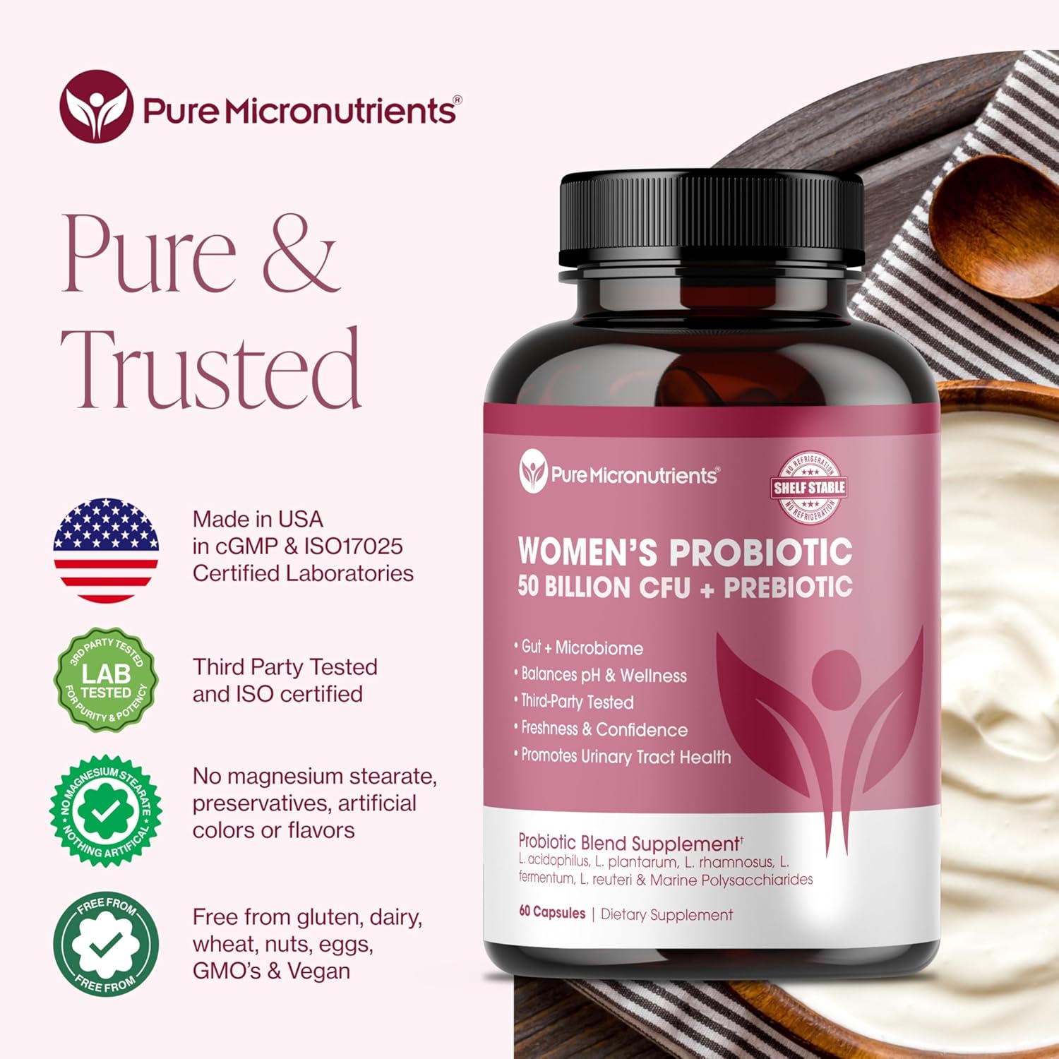 About this item NO MORE BV, UTIs & YEAST: 50 Billion CFU per serve probiotics for women with Lactobacillus Acidophilus & prebiotics support vaginal probiotics, gut health & urinary tract care. RESTORE PH BALANCE & VAGINAL HEALTH: Women's probiotic supports vaginal flora, combats odor, infections & promotes feminine pH balance for optimal wellness. DIGESTIVE & GUT HEALTH SUPPORT: Probiotics and prebiotics for women relieve bloating, constipation & support gut health, digestion & immune function. SLOW-RELEASE & SHELF-STABLE: Our gut health probiotics for women use Bi-Pass technology for better absorption, no refrigeration needed, gentle on the stomach. PURE, SAFE & EFFECTIVE: Non-GMO, gluten-free, dairy-free, USA-made probiotic for women’s health with third-party testing & satisfaction guarantee. See more product details,NO MORE BV, UTIs & YEAST: 50 Billion CFU per serve probiotics for women with Lactobacillus Acidophilus & prebiotics support vaginal probiotics, gut health & urinary tract care,RESTORE PH BALANCE & VAGINAL HEALTH: Women's probiotic supports vaginal flora, combats odor, infections & promotes feminine pH balance for optimal wellness,DIGESTIVE & GUT HEALTH SUPPORT: Probiotics and prebiotics for women relieve bloating, constipation & support gut health, digestion & immune function,SLOW-RELEASE & SHELF-STABLE: Our gut health probiotics for women use Bi-Pass technology for better absorption, no refrigeration needed, gentle on the stomach,PURE, SAFE & EFFECTIVE: Non-GMO, gluten-free, dairy-free, USA-made probiotic for women’s health with third-party testing & satisfaction guarantee