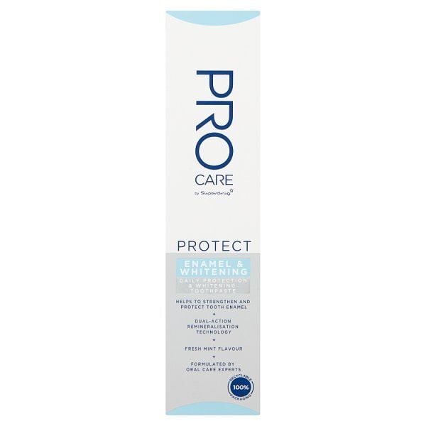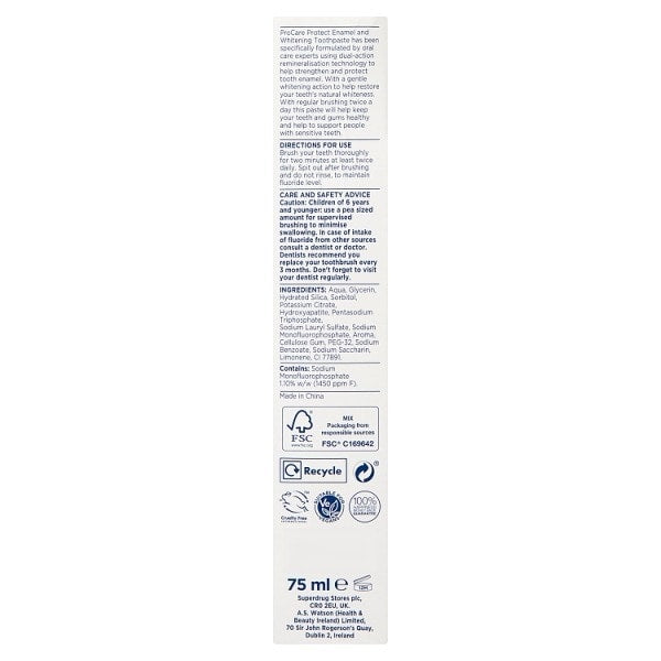 Product Information:Procare Protect Enamel &Amp; Whitening Toothpaste Has Been Specifically Formulated By Oral Care Experts Using Dual-Action Remineralisation Technology To Help Strengthen And Protect Tooth Enamel,Features:Procare Protect Enamel &Amp; Whitening Toothpaste Has Been Specifically Formulated By Oral Care Experts Using Dual-Action Remineralisation Technology To Help Strengthen And Protect Tooth Enamel. With A Gentle Whitening Action Help To Restore Teeth’S Natural Whiteness,Warning Or Restrictions:Children Of 6 Years And Younger: Use A Pea Sized Amount For Supervised Brushing To Minimise Swallowing. In Case Of Intake Of Fluoride From Other Sources Consult A Dentist Or Doctor,Product Specification:Aqua, Glycerin, Hydrated Silica, Sorbitol, Potassium Citrate, Hydroxyapatite, Pentasodium Triphosphate, Sodium Lauryl Sulfate, Sodium Monofluorophosphate, Aroma, Cellulose Gum, Peg-32, Sodium Benzoate, Sodium Saccharin, Limonene, Ci 77891. Contains Sodium Monofluorophosphate 1.10% W/W (1450 Ppm F),Product Uses:Brush Your Teeth Thoroughly For Two Minutes At Least Twice Daily. Spit Out After Brushing And Do Not Rinse, To Maintain Fluoride Level,Recyclable:100% Recyclable